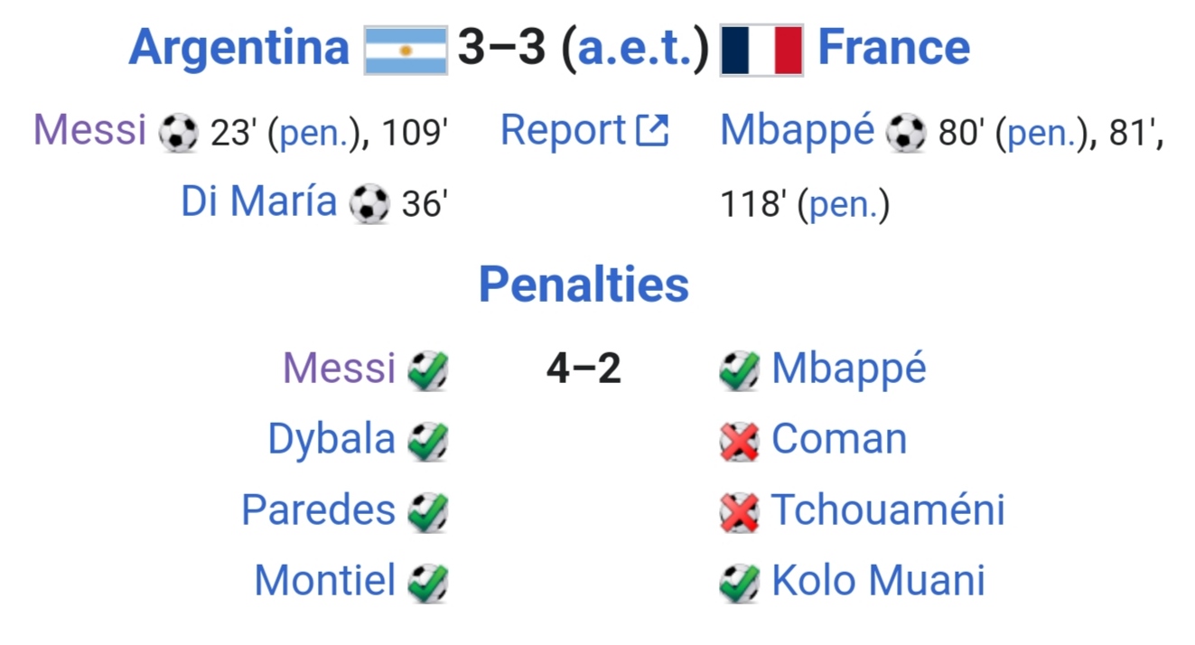 Lionel Messi, possibly the GOAT claims his first World Cup title in his final game for his country. Mbappe becomes only the second player to score a hattrick in a World Cup final matching England's Geoff Hurst from 1966. Yet Mbappe ends on the losing team.