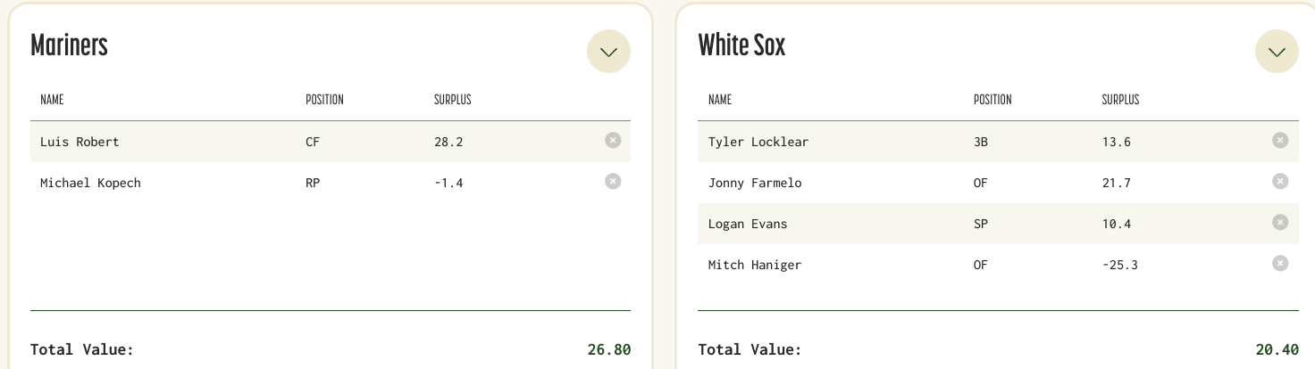 The second deal gets rid of Mitch's contract (he's a hull of his former self), and adds a potent bat as another arm in the bullpen. Again, I don't know if it's enough, but it seems like a doable deal to me. The only concerns I have are around Robert's health and durability as well as the fact that some of his value comes from his presence in CF. What do you do with him? Full time DH? Can he swing to RF to replace Mitch?