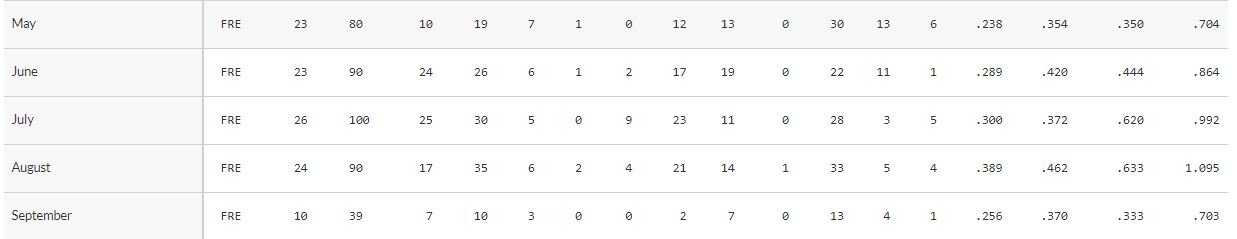 .The lefthanded-hitting Veen endured 120 at-bats without a home run to start his career at Low-A Fresno before finally ending the drought on June 20. He entered play that day hitting .235/.372/.388.