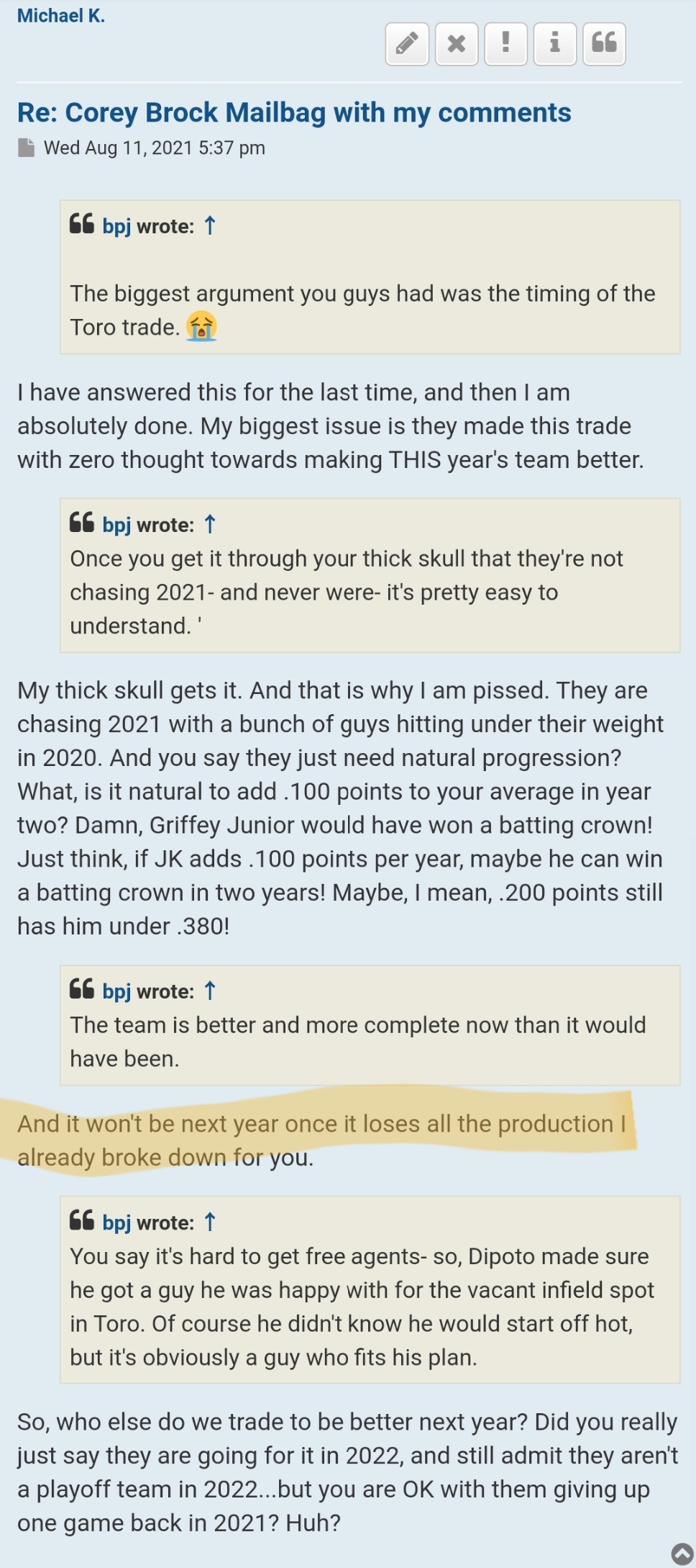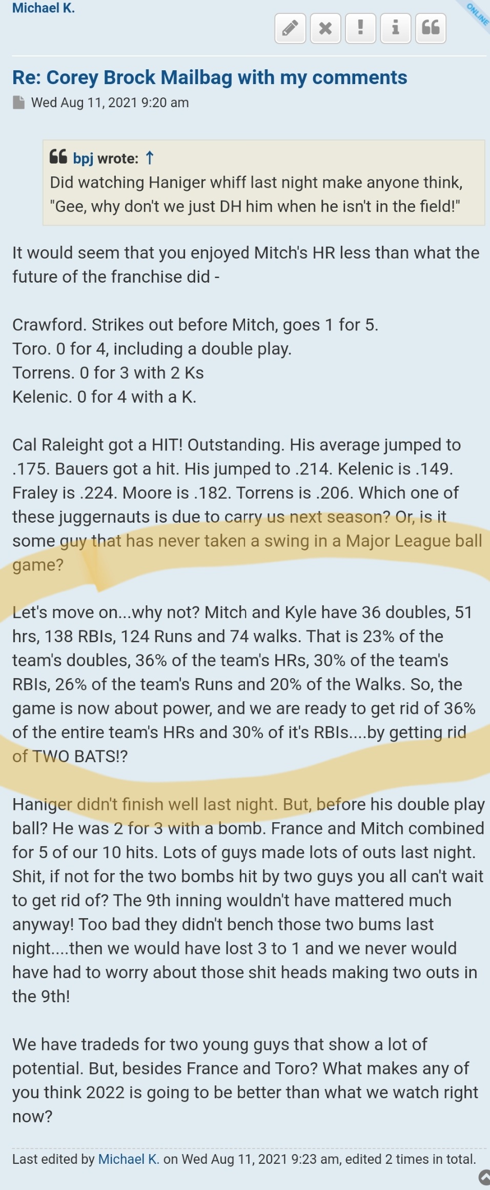 And, most importantly, that trade was made by this organization with zero evidence that Toro would help today. They aren't playing to win it all or nothing in 2021. This is probably the dumbest part of your argument. "Dur, Dipoto didn't even know the player he had targeted just like he did France and Haniger was even any good. Dur dur." You're an absolute assclown. They didn't care about this year. One game back? They didn't care....why try to get into the playoffs when you can gain years of control. Because the team isn't good enough to win it all unless they paid more than other teams did to acquire 2-3 game changing players. Turns out? Toro is a stud....but the idea is what pisses me off. Dipotto himself came out and asked for patience, wait until the rest of the moves. Even HE didn't think the trade would help them this year. Then he added a SP and RP, and voila, we're better, now and in the future. Sorry the idea pisses you off though bud.