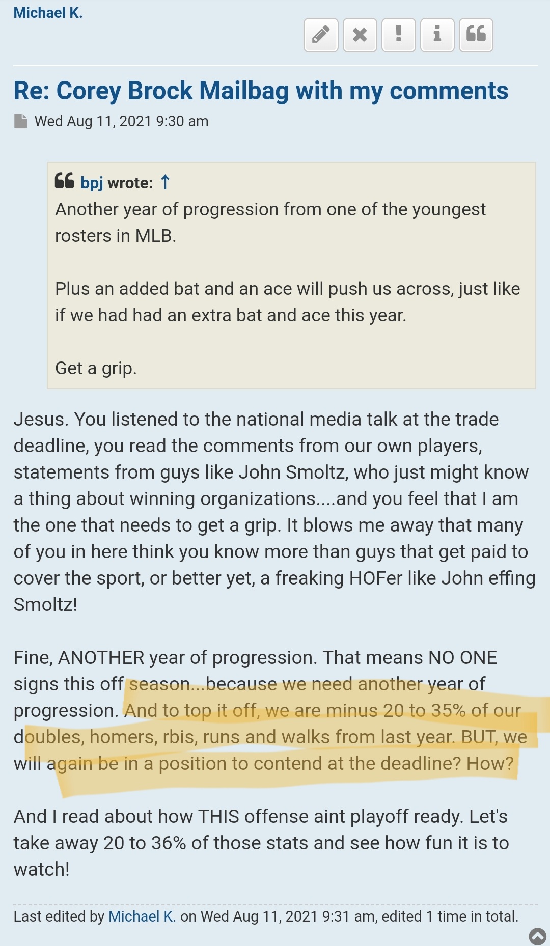 Michael K. wrote: ↑Thu Aug 12, 2021 3:13 pmYou are confusing. You say they aren't a playoff team, then show me standings to make it look like they are? Make up your mind, are they or are they not? Are they not 4 games worse than they were at the high water point of the season just a couple of weeks ago?