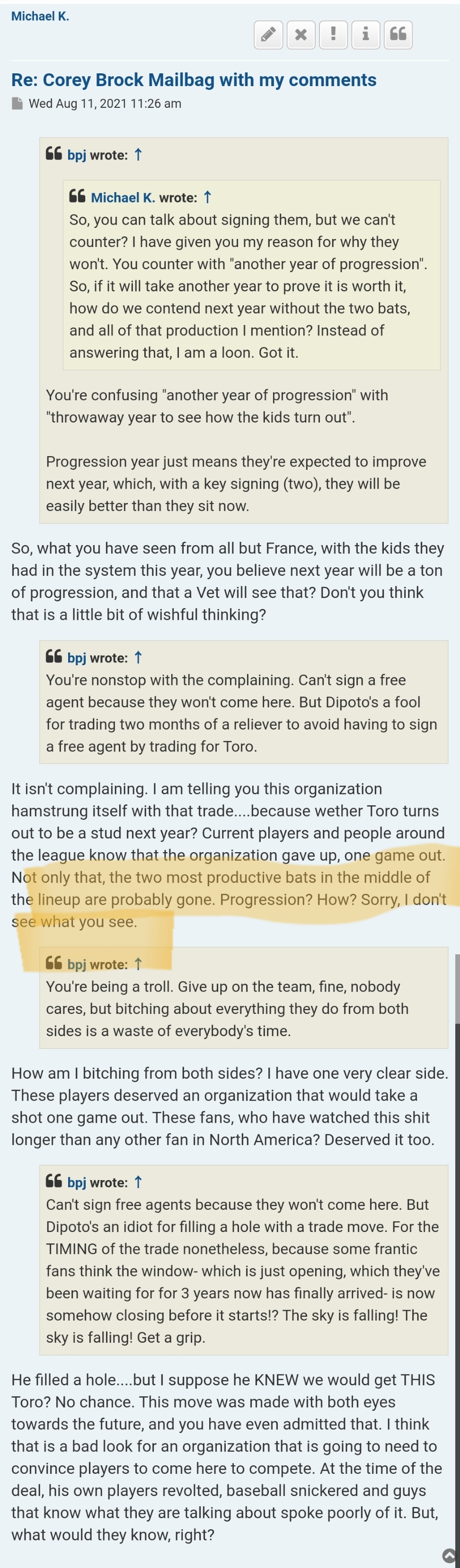 What the fuck does that even mean? I have said he didn't think Toro would help them THIS FUCKING YEAR. What does France and Haniger have to do with that?They aren't playing to win it all or nothing in 2021. This is probably the dumbest part of your argument. "Dur, Dipoto didn't even know the player he had targeted just like he did France and Haniger was even any good. Dur dur." You're an absolute assclown.