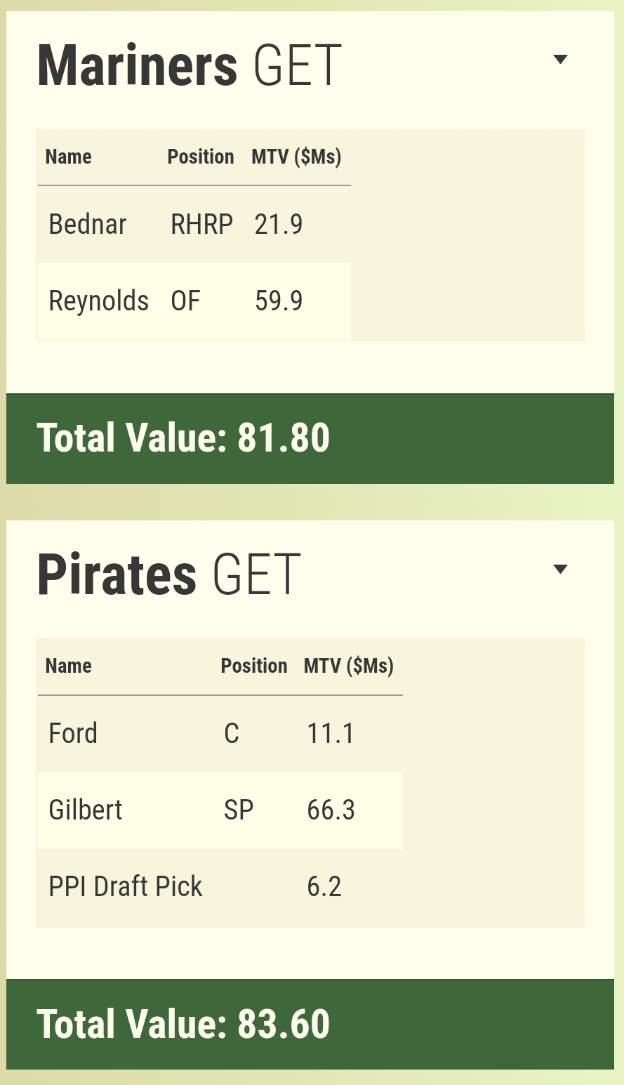 I think 7 M is a bit light for an additional 1st Rd. pick. Hancock has TOR possible projection top of the 1st Rd. pick and he appears to be healthy and performing well up until hitting the wall last year. Ford is another top 100 types, and the pick = a 3rd type 100 type. Reynolds was only a 126 OPS+ 2.9 WAR player in 2022. He has 3 years of control. How much do you really want to give for a guy that should probably not be in center anymore. He was -14 in 2022, and -5 runs above replacement in 2o21 before being 1 and 2 runs above average in his 1st 2 years. The Pirates probably waited a year too long.