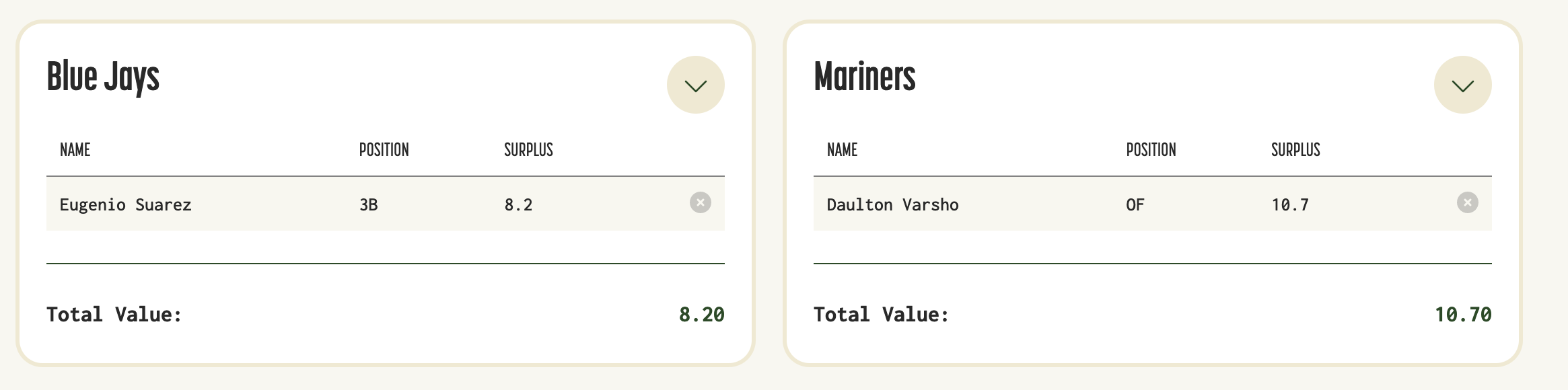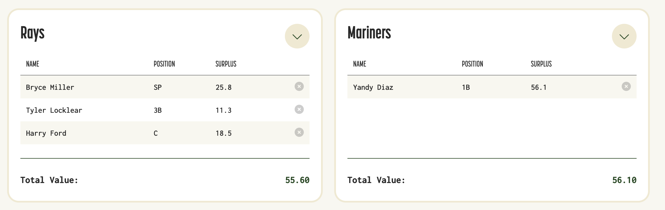Morosi suggested a deal for Miller or Woo would be close. I checked the trade calculator, and it would likely cost a couple of top prospects as well, so this trade would hurt us immediately with the loss of Miller, and in the long term with Ford and and Locklear. Assuming the Rays would even pull the trigger. But this would be a huge upgrade, and we'd have Diaz through 2025 with a club option in 2026.