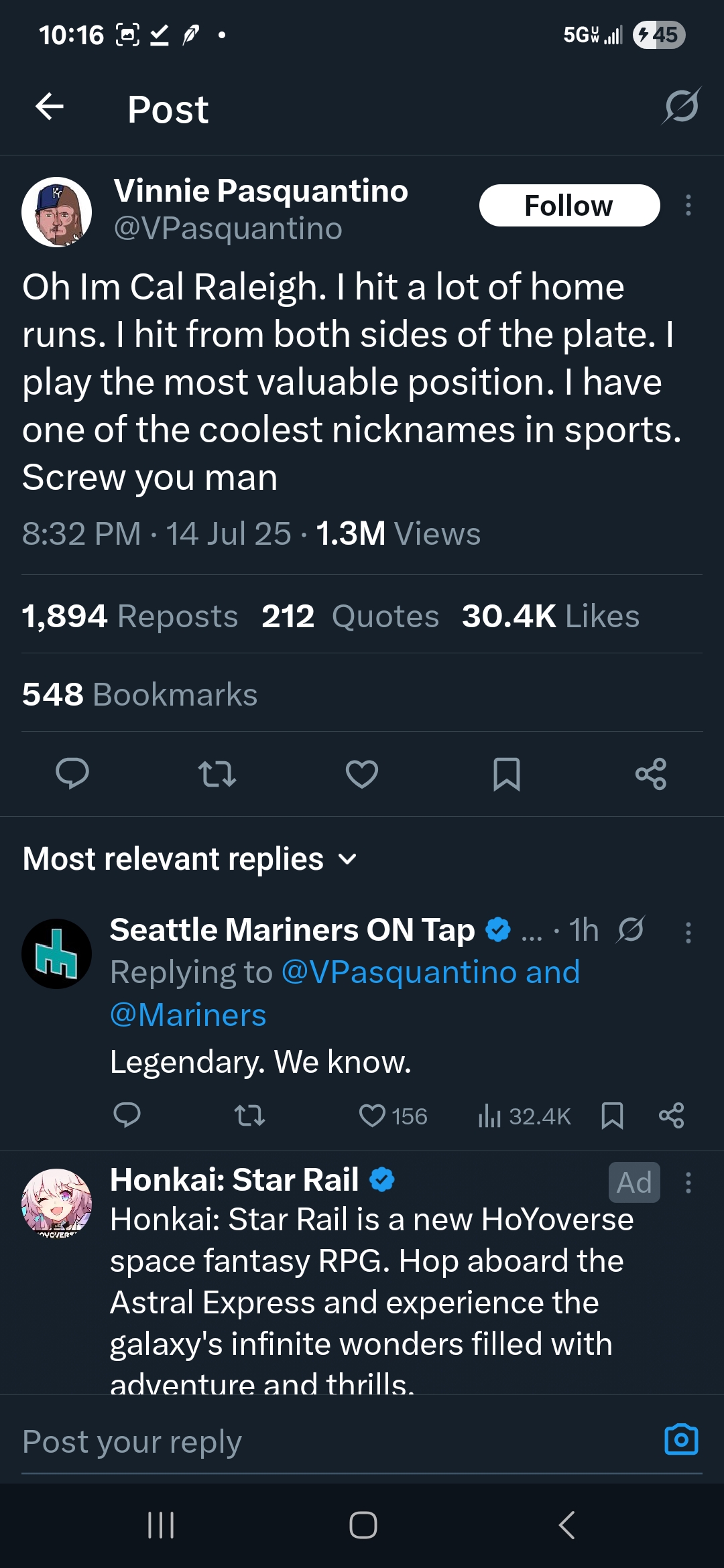 well JK managed to contribute something positive to his Mariner legacySexymarinersfan wrote: ↑Tue Jul 15, 2025 3:18 amThat was so awesome!! Apparently not everyone is happy.seattlefan-daBronx wrote: ↑Tue Jul 15, 2025 3:10 amCAL !!!!!!!!!!!!!!!!!!!!!!!!!!!!!!!!!!!!!!!!!!!!!!!!!!!!!!!!!!!