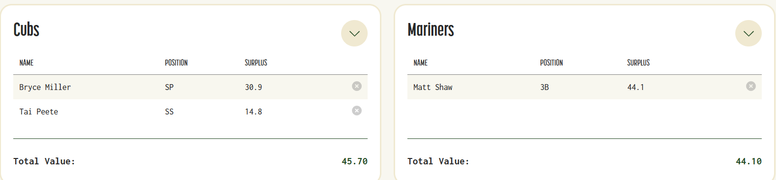 What would the numbers look like if you had Kirby or Miller as the headliner? My thinking is something like that is what it would take. It might even take Kirby (or Miller) + Cole Young + Prospect. Cole Young then becomes their super utility instead of Matt Shaw. I'm not sure I would do it, but I might. I think Kirby probably gets traded next offseason anyway.