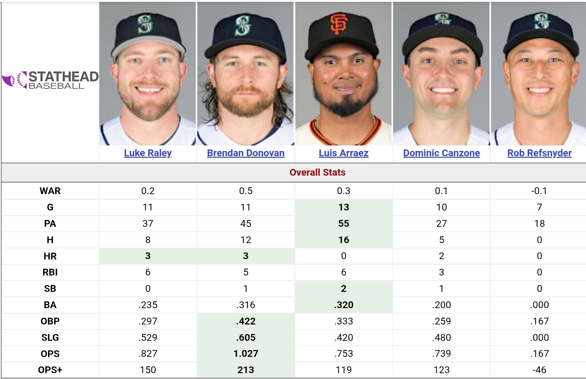 Getting hits, and getting on base, on one of only two teams in MLB with a lower team offensive WAR than the Mariners. Hitting lefties better than righties. Has as many plate appearances as Cal Raleigh, so he's not being plattoned, imagine that.