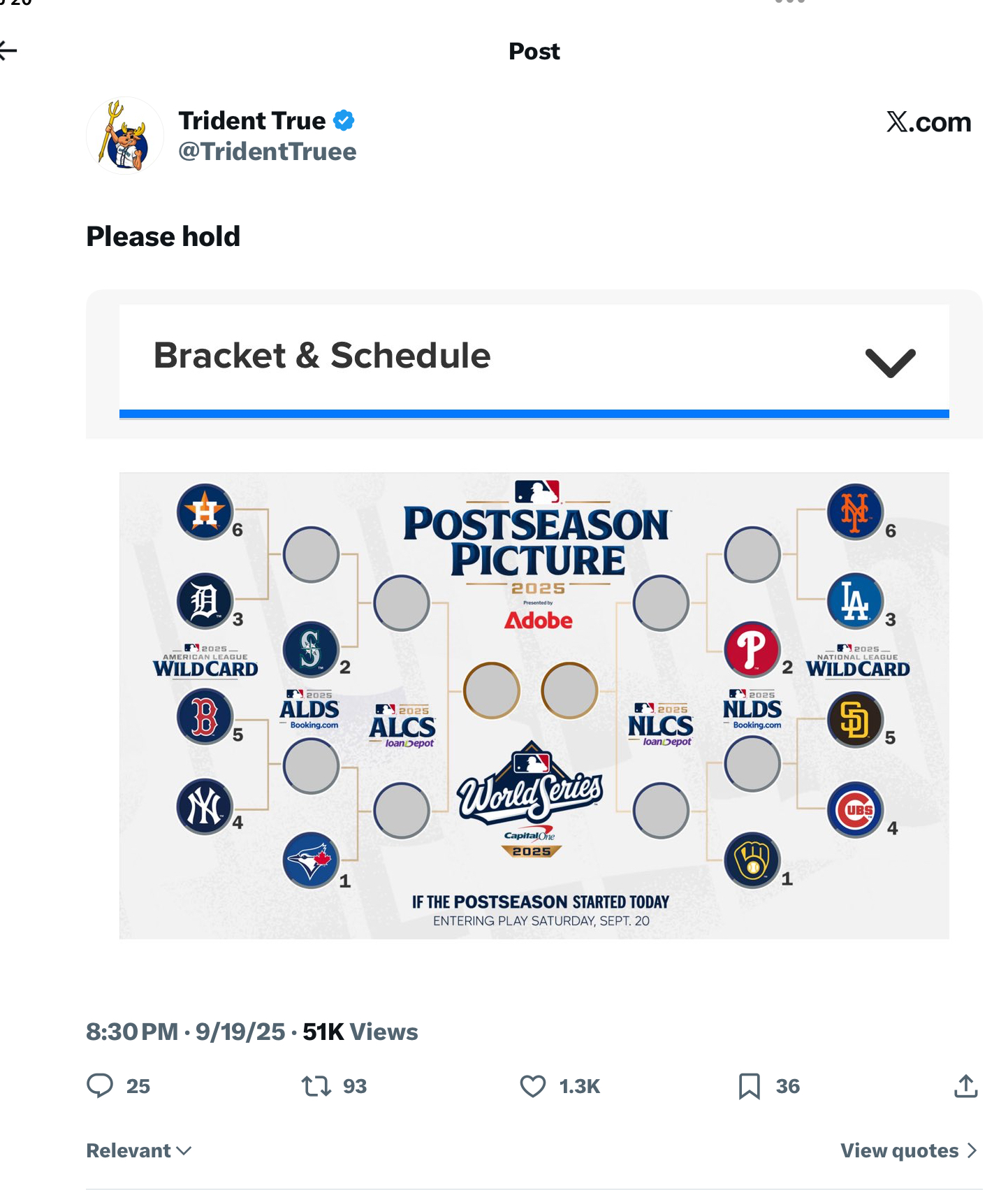 sorry but dreaming big is the Mariners knocking off the Dodgers in the WS. The Dodgers are the evil empire at this point. The mariners do that and dipoto never has to pay for his drink the rest of his lifeCoeurd’Alene J wrote: ↑Sat Sep 20, 2025 10:31 amLet’s dream big