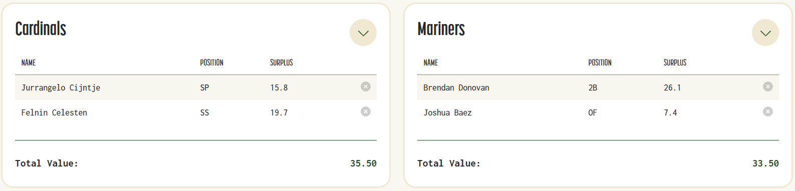 Trade Arroyo for 25 yo Abner Uribe. How cool to have a guy named after the inventor of baseball who is also a lights out reliever. 1.67 ERA, 2.75 FIP and 90Ks in 75 IPs. Brewers get a kid who has absolutely raked his entire minor league career and is very close to his big league debut despite a hiccup late in the season in AA. I would be happy to add more to get this done. Trade JC and Celesten for Donovan and Joshua Baez, a 22 yo RH OFer that had a .883 OPS in AA last season. Perfect replacement for Randy in 2027. Obviously Donovan would play 2B.