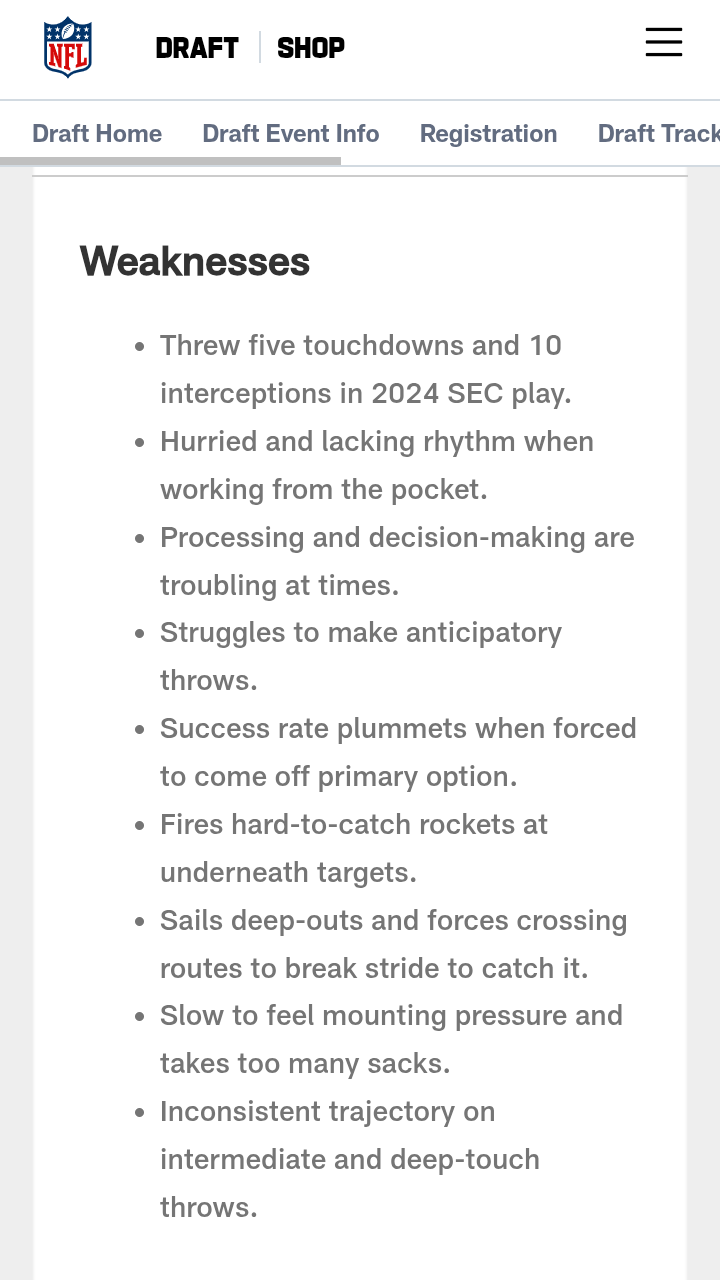 Milroe is an explosive athlete who is very capable outside the pocket, but he lacks accuracy, touch and decision-making when he’s inside the pocket. A lack of anticipation and timing leads to interceptions and contested throws to intermediate areas of the field. He has an NFL arm, but he might need to fine-tune his footwork and delivery to improve accuracy on all three levels. He can get through his reads when he’s confident and feels protected but becomes predictable and easier for defenses to manipulate when he’s rattled. He’s built like a Will linebacker, runs like a receiver and is a threat to hit the home run on called runs and scrambles. Milroe was a much better deep-ball passer in 2023, but his 2024 regression makes it harder to project success from the pocket at a high enough rate to become a capable NFL starter. A strong arm and elite speed will have teams intrigued, but if he doesn’t make it as a starter, it’s incumbent upon his team to find a way to get the ball in his hands with packaged plays.” — NFL.com