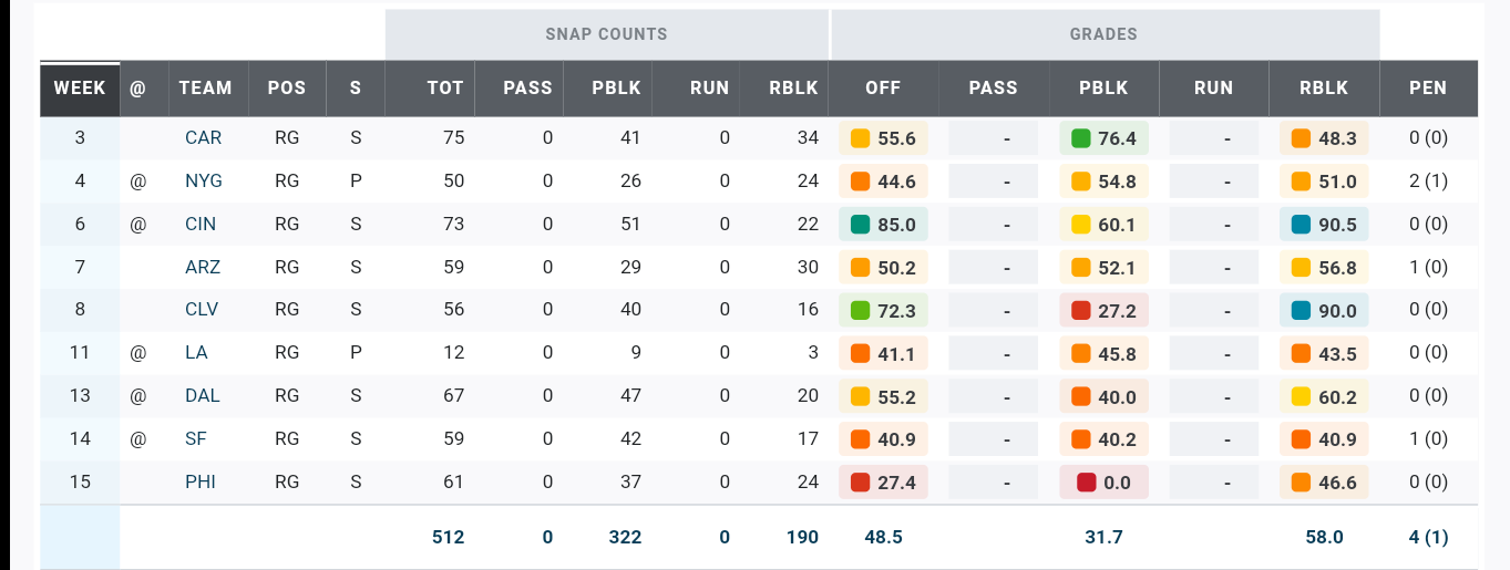 The numbers in the far right columns of both tables are total offensive and defensive snaps.