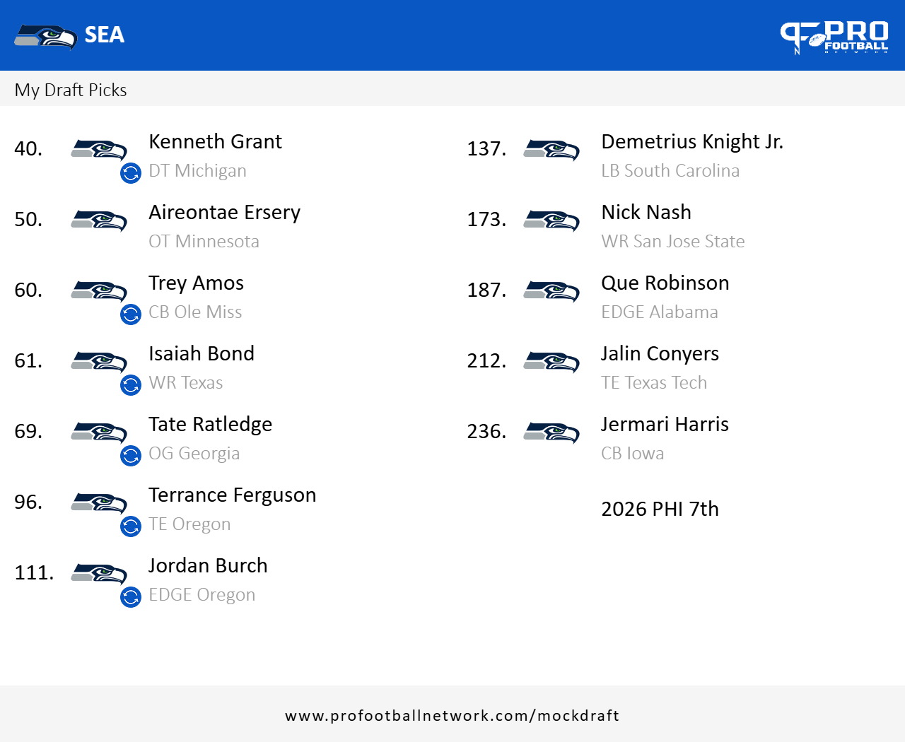 my best result yet - talk about restocking the cupboard! hit on nearly every need position, assuming Darnold gets signed as QB. add depth with extra picks from the 1st pick tradedowns. 2 receivers and 2 Tight Ends hedge against possible loss of DK or Fant. 2 boundary corners allow Spoon to play inside and push Riq. Ersery is insurance for Lucas or becomes your swing tackle, Ratledge replaces Laken. Conyers doubles as a FB. Burch is a stud when healthy, great value day 3, as is getting Grant at pick 40 - i've seen him going as high as 9 overall! add Darnold and a center in FA (Dalman or Kelly?) and you're in business.
