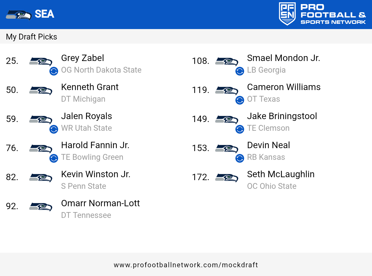 That's precisely what the Seahawks did in a new seven-round mock draft from Pro Football Network. A projected trade with the Chicago Bears sends offensive lineman Braxton Jones to Seattle in exchange for pick No. 82 overall.