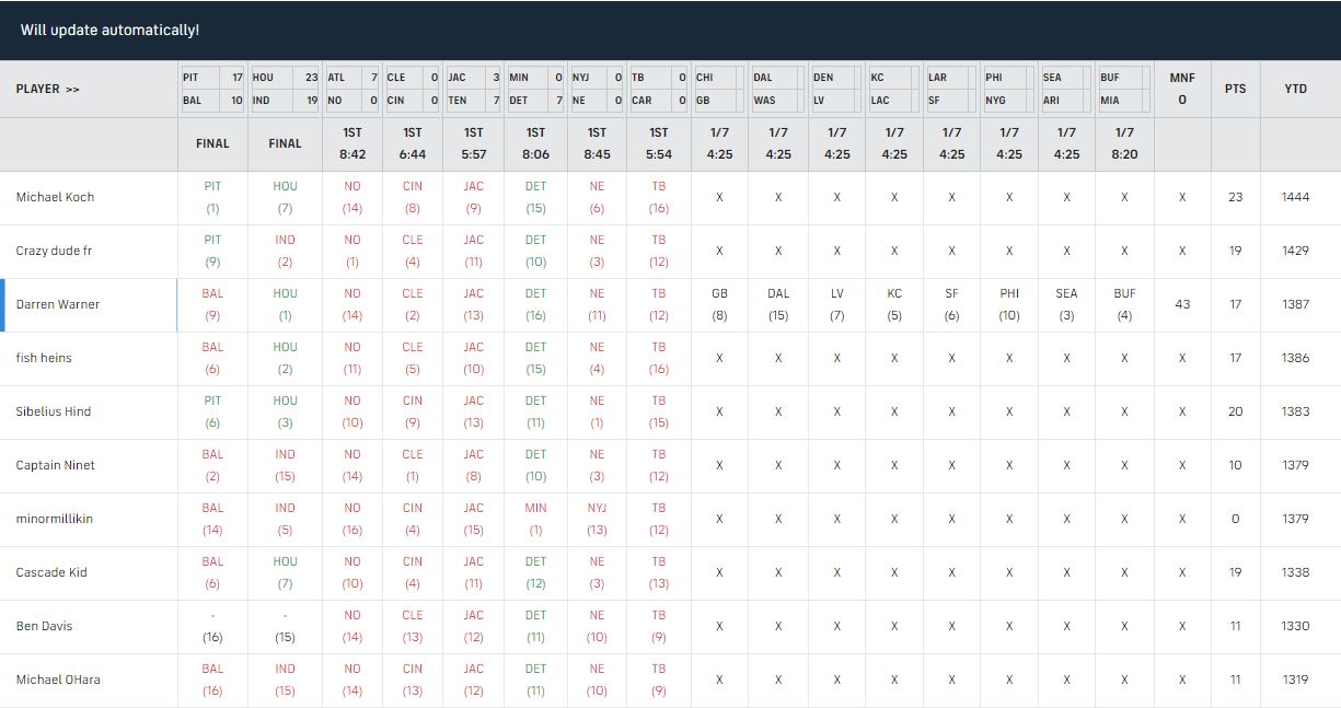 This pool has playoffs so you ain't dead yet!maoling wrote: ↑Sun Jan 07, 2024 5:23 pmJust a little taste of what's in store for you next season, when I open up a can of Whoop-Ass on your bee-hinds, and you learn about Utter Devastation at the hands of maoling.D-train wrote: ↑Sat Jan 06, 2024 11:16 pmHa. And the guy in dead last of the remaining pickers, maoling had the highest score of the season. lolCaptain 97 wrote: ↑Sat Jan 06, 2024 11:07 pmI'm the only one in the top 12 that hasn't had a win yet. I'm due!![]()