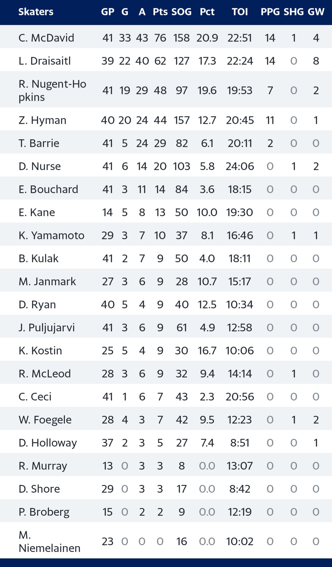 All 4 lines can light it up. Here they are compared to the Edmonton Soilers whose top scorers dwarf ours but our scoring depth crushes theirs.