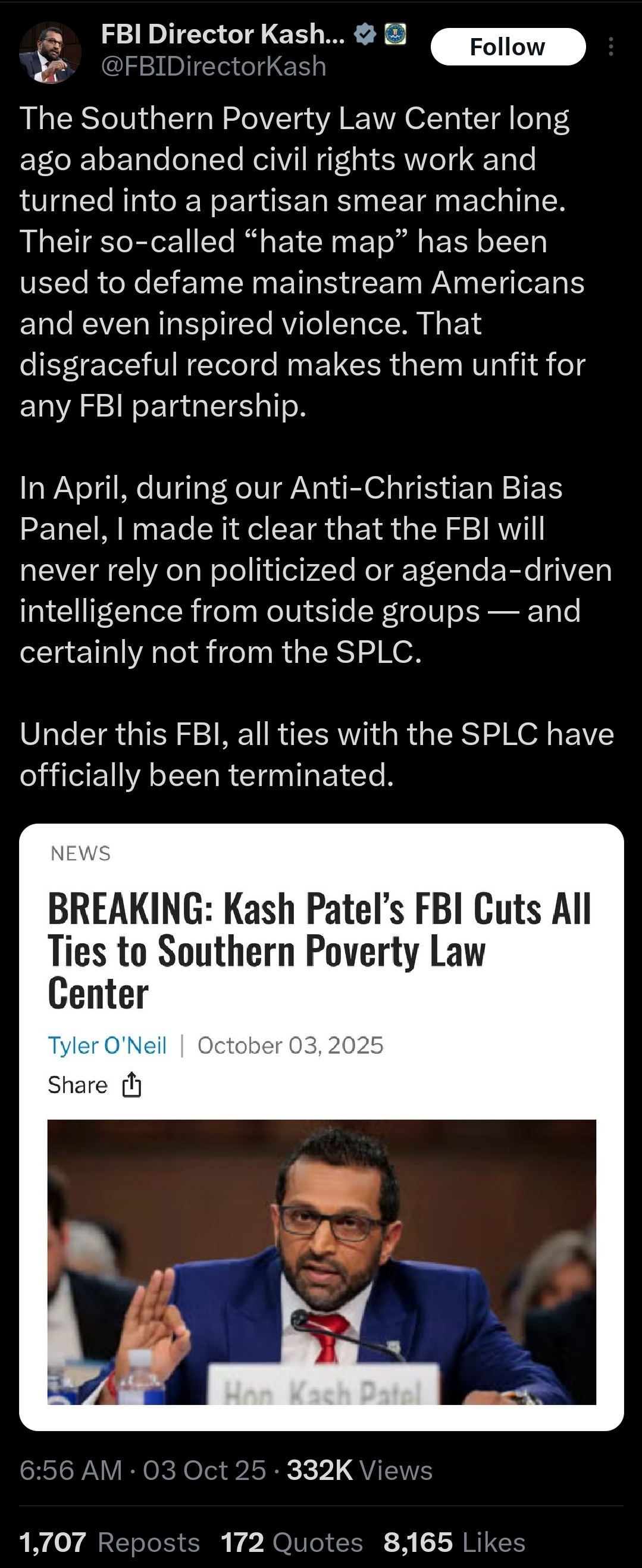 SPLC has been an enemy of the United States forever. In league with the ACLU, they sue everything under the sun in terms of government law and policy and advocate for every woke con game known to man. Founder Morris Dees was a perv/ atheist.