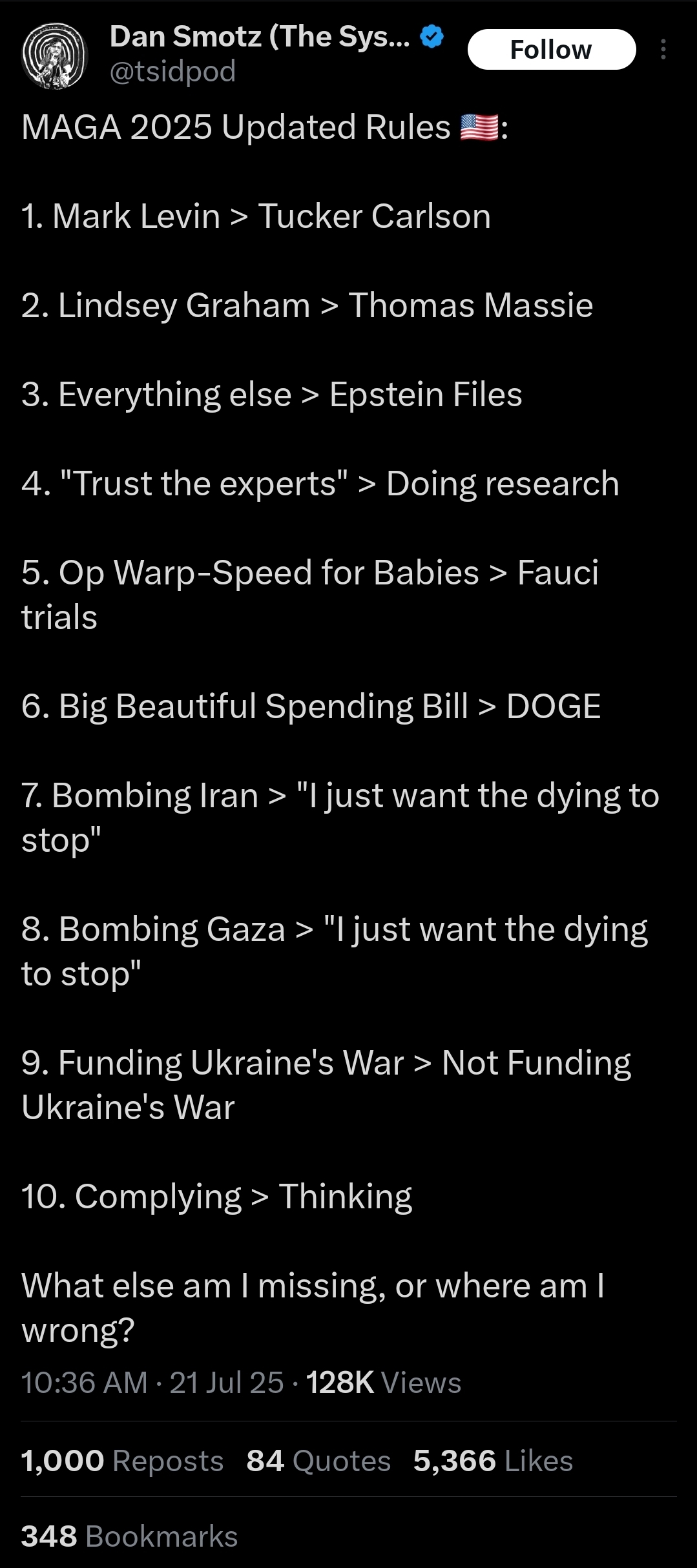 I guess we'll know when we see the files.ddraig wrote: ↑Tue Jul 22, 2025 5:00 pmThink, guys. If Trump were on any list of Epstein's, don't you think the Dems would have used that information BEFORE this last General Election? It would have killed any chance of him becoming President. The Dems could have run ELMO and won with that info. Come to think of it, that is who they put up for President!
