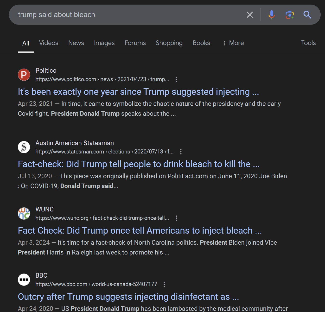 I interpret that as Trump simply being a moron incapable of understanding basic matters of science. People were in horror that a President could be so woefully unprepared in consulting with scientists and doctors on Covid. Someone with basic intelligence wouldn't go near the verbiage he used in that instance.Walla Walla Dawg II wrote: ↑Wed Aug 14, 2024 6:55 pmBleach: