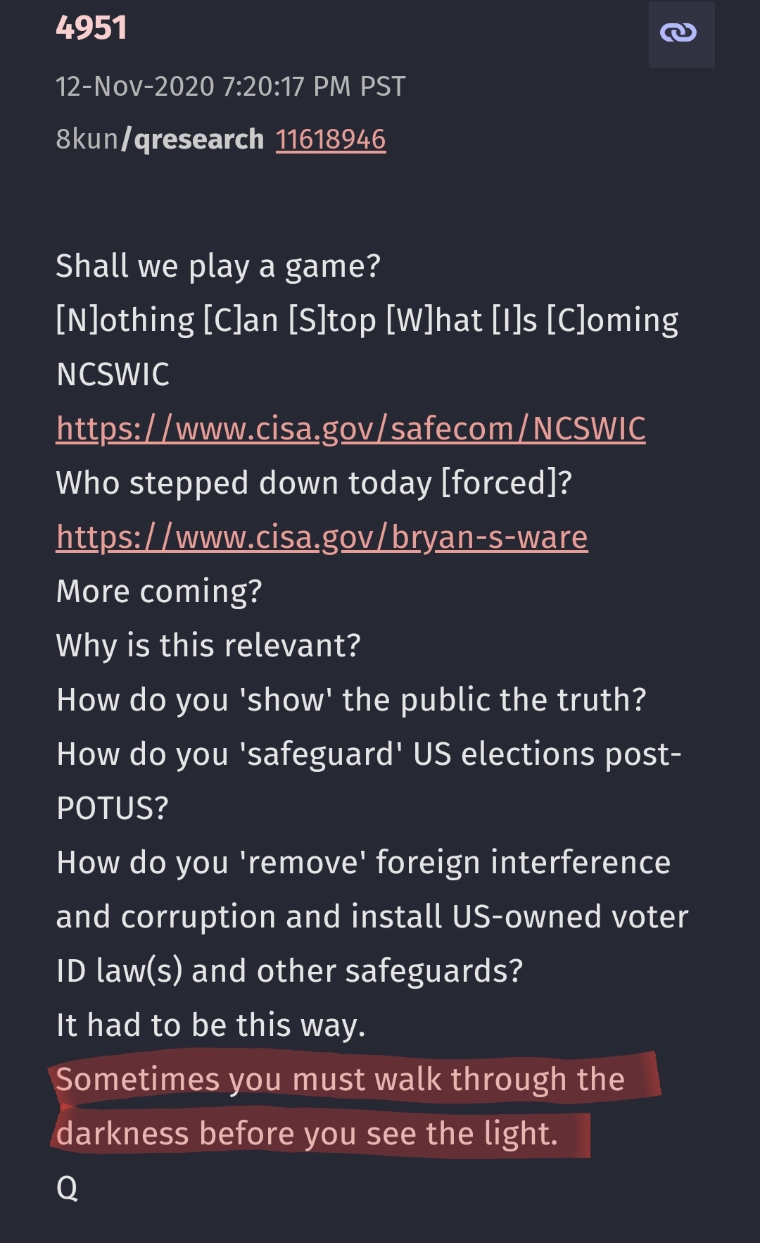 We are going to find out very soon whether we should have trusted Wray and Sessions, but by Wray/Barr delaying any cases they have to file, allowed the election to go on and have the fraud caught and exposed.