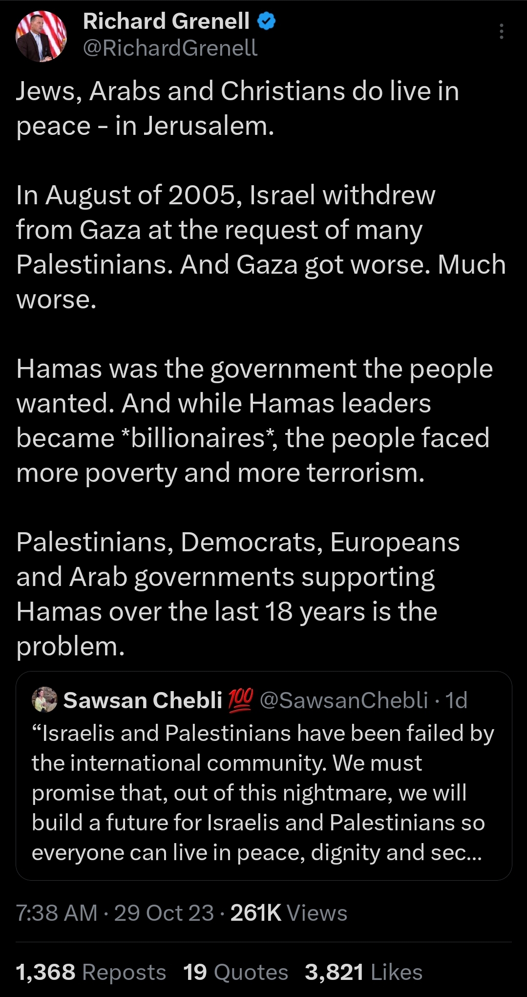 But Hamas is to Palestine what Democrats are to America what the Zionists are to the Jews. As in, they don't represent all of us.