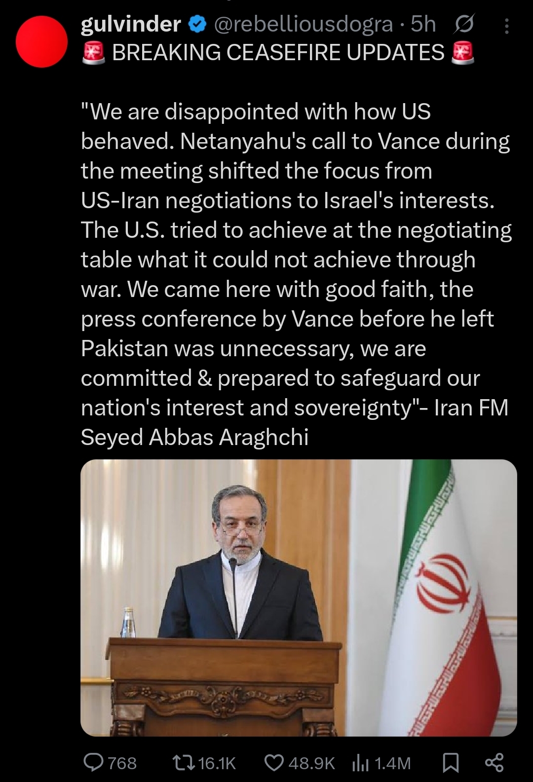"The US tried to achieve at the negotiating table what it could not achieve through war."Donn Beach wrote: ↑Sun Apr 12, 2026 7:46 amThat's not negotiation