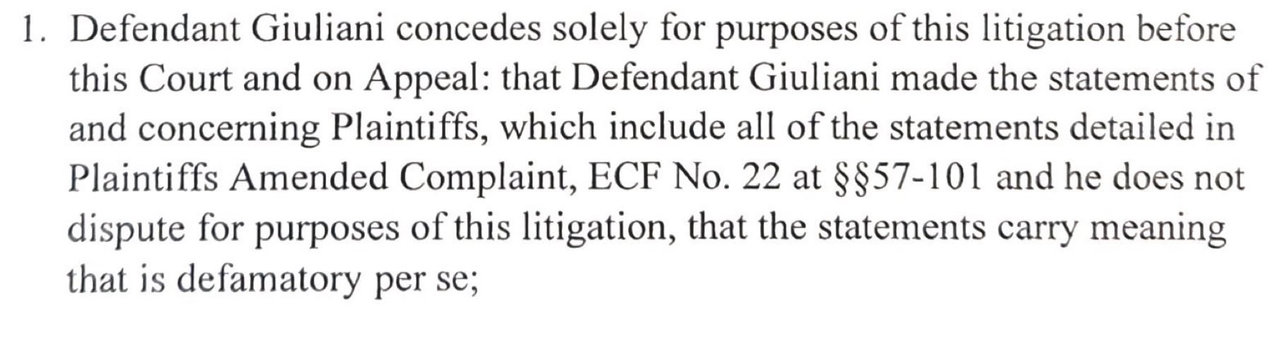 Giuliani conceded his claims about Freeman and Moss were “defamatory per se.” And “to the extent the statements were statements of fact and other wise actionable,” he said, “such actionable factual statements were false.”