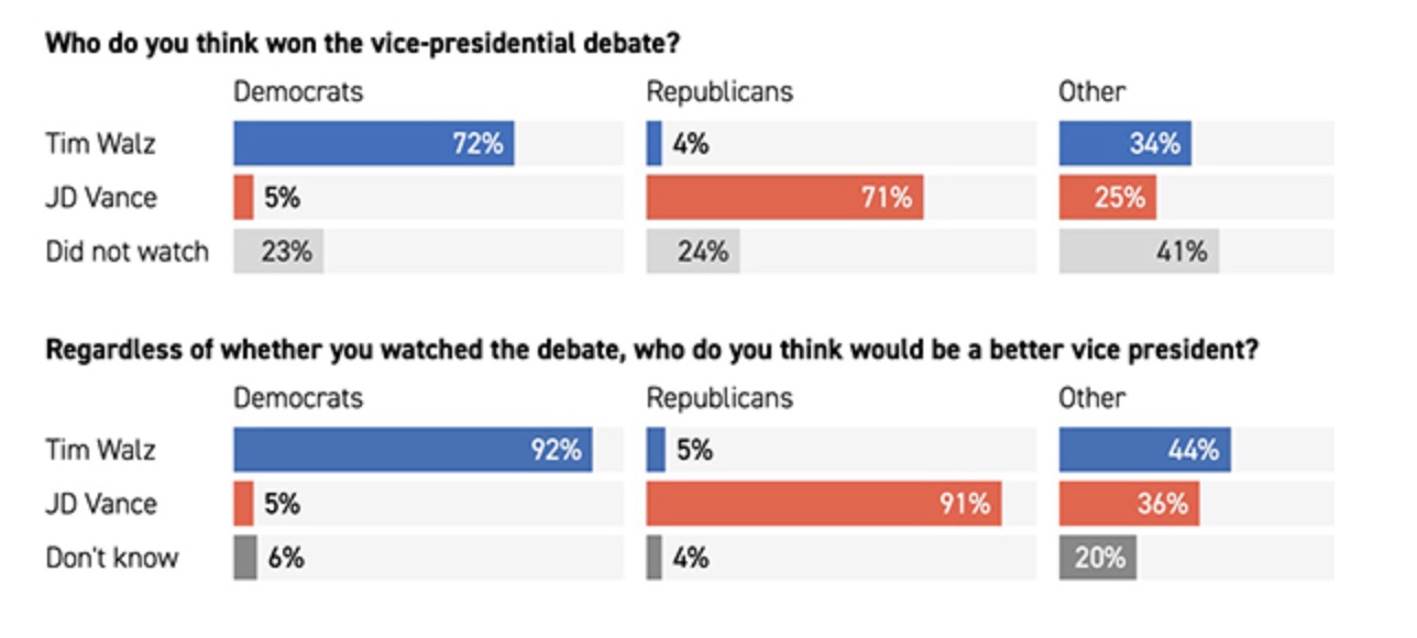 Not surprisingly (I suppose): overall, Republicans thought that Vance won; Democrats that thought that Walz won.
