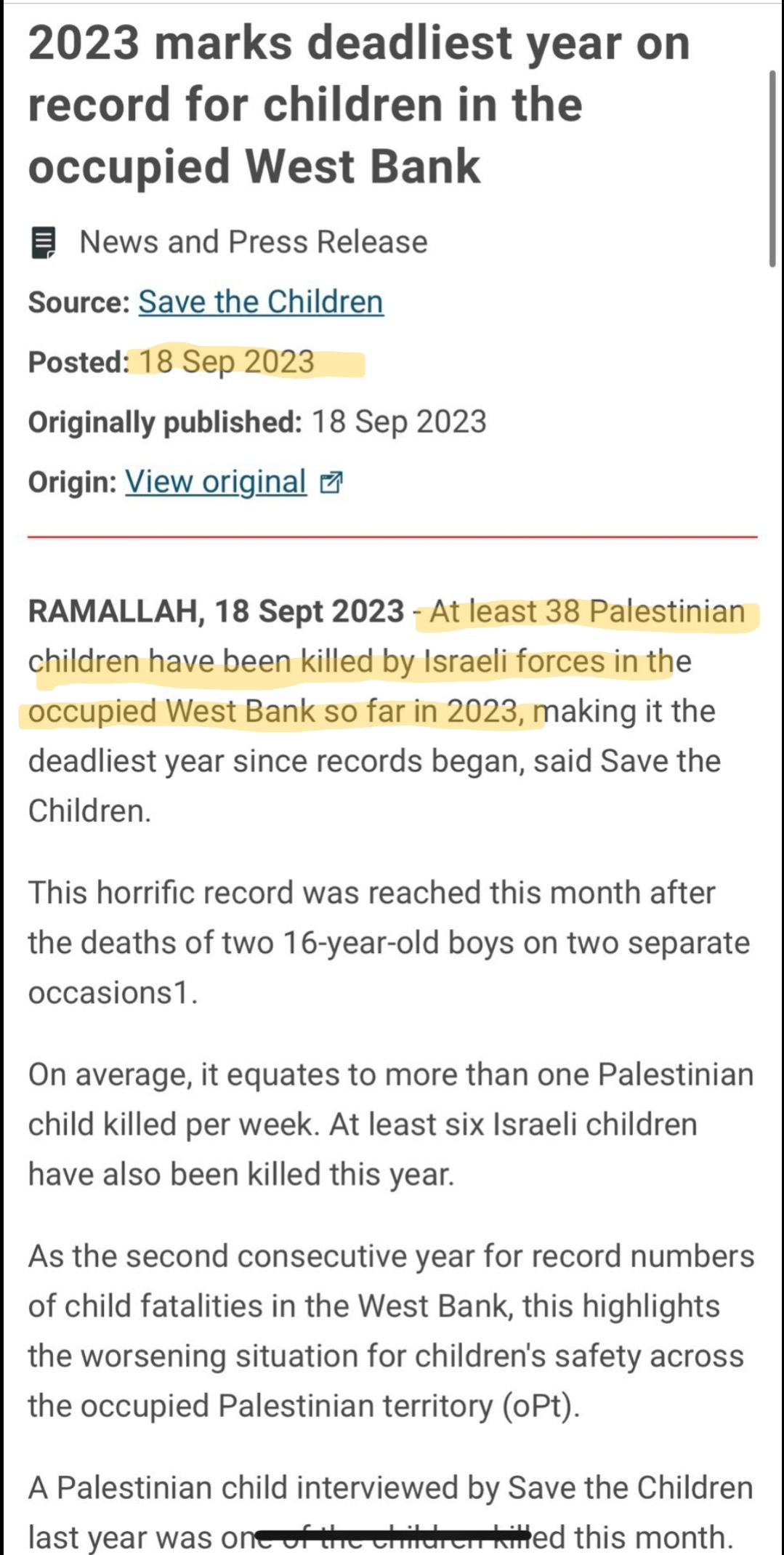 Like saying Palestinians started the war with Israel on 10/7 when Israel had already killed 38 Palestinian kids before October.