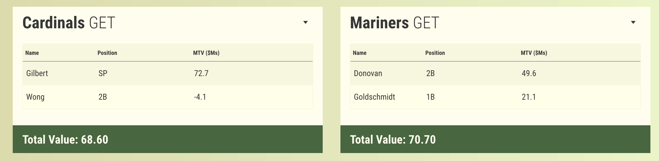 Only way I'm trading Gilbert is for a significant bat with control in return. Donovan is basically a poor-man's Ian Happ with the bat... doesn't move the needle enough. Goldschmidt is fine, but I'm not off loading a top-tier starting pitcher when half the return haul is for 1.4 seasons of a 36-year-old 1B.