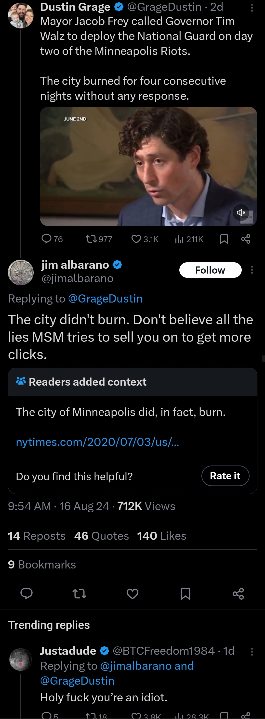 This article has plenty more insight for those fooled by Donn's quote into thinking Trump thought Walz did a good job handling the riots."I know Gov. Walz is on the phone, and we spoke, and I fully agree with the way he handled it the last couple of days," Trump told a group of governors on June 1, 2020, according to a recording of the call, in which he also called Walz an "excellent guy."
