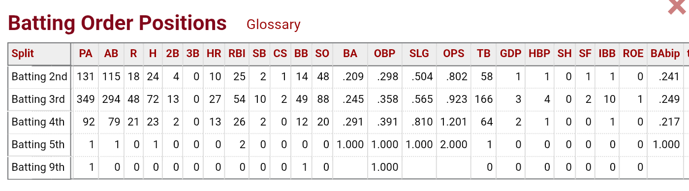 I'm pretty sure Cal prefers batting later in the lineup. I posted this earlier in the thread but nobody responded so i assume you guys regard the sample size as too small to be significant.