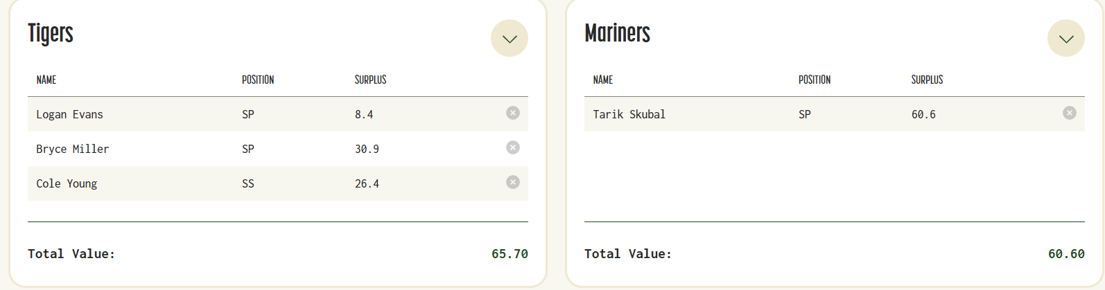I don't think there's any way the Tigers would ever make that trade.Captain 97 wrote: ↑Thu Dec 18, 2025 11:55 pmTrading Bryce Miller, Cole Young and Logan Evans for Skubal