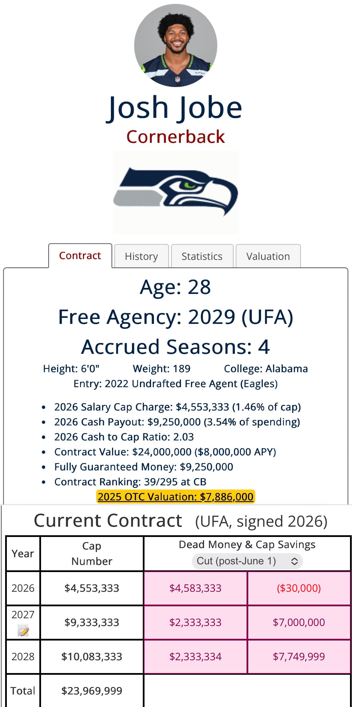 An ACL tear cut his rookie season short and limited his playing time in 2024. Mitchell returned to Baltimore’s RB rotation in 2025, rushing for 341 yards and a touchdown on only 59 carries. Baltimore did not tender him as a restricted free agent, which means the speedy Mitchell (4.37 in the 40-yard dash) is now unrestricted and wouldn’t count against the Seahawks in the comp pick formula. Starting back? Let’s ease up there. But he may be a fit in Seattle’s running back room if he reunites with Mike Macdonald.