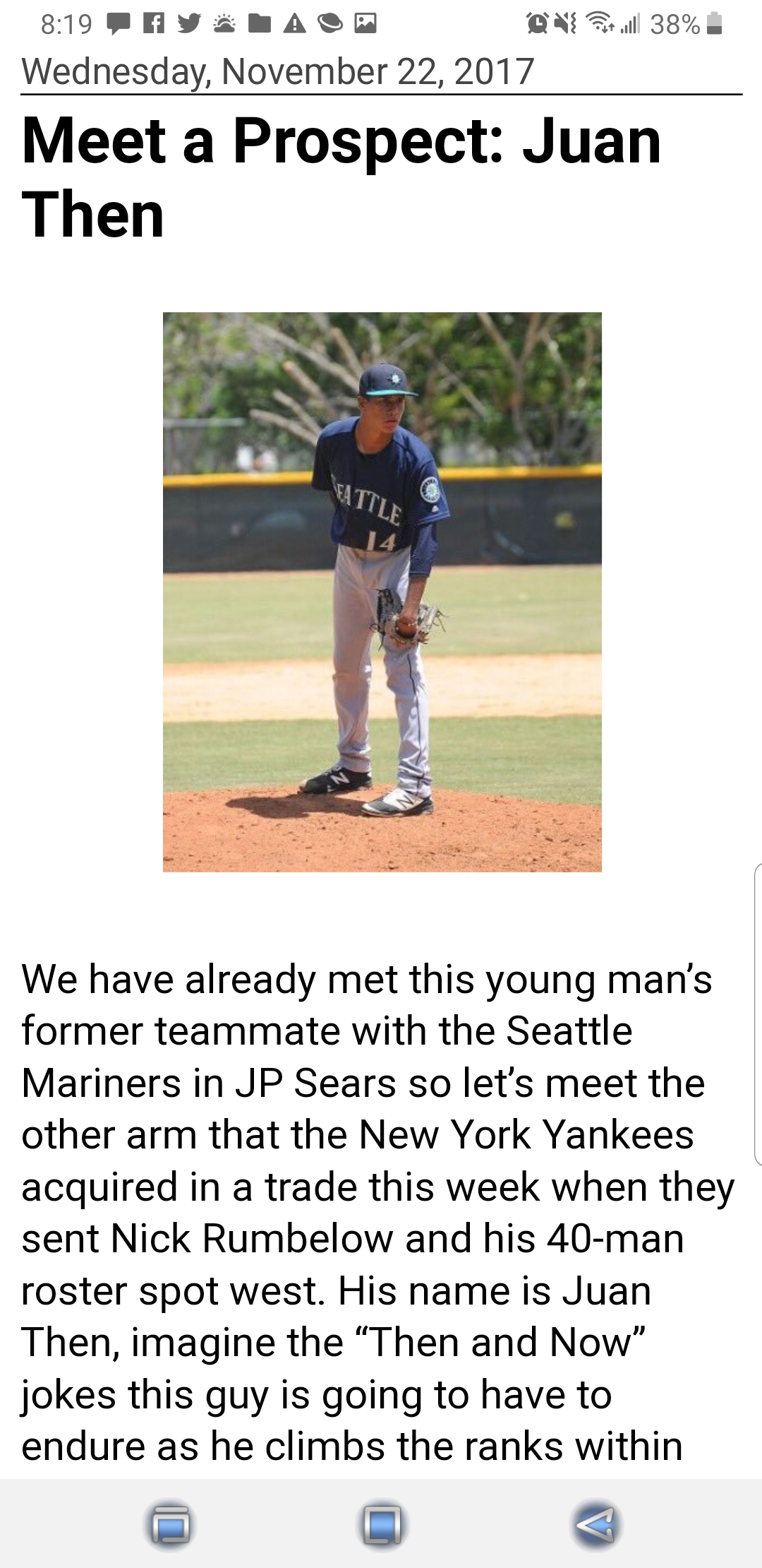 Encarnacion still owed more than $15M in salary and buyout. Source says #Yankees and #Mariners essentially splitting the money. SEA paid more to get better prospect - pitcher Juan Then, who should move into 15-20 range on SEA top prospects list. First with Then: @Joelsherman1.