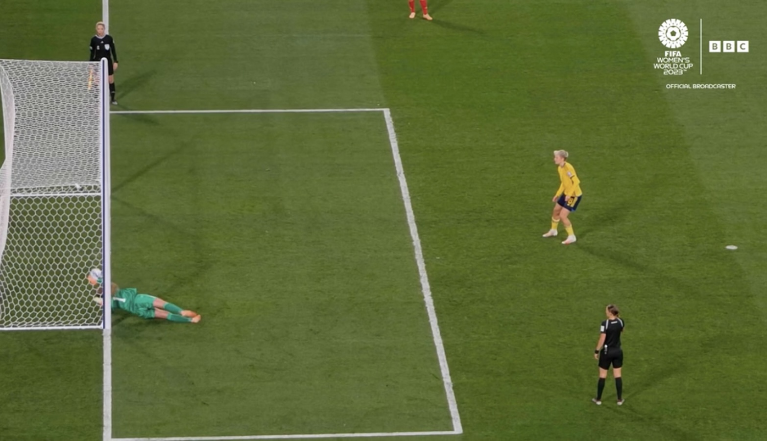 The finest of margins. This is how the US team were eliminated. After what looked like a fabulous save from their keeper in the penalty shootout with the team behind 4-5 - the ball looped up and back under the crossbar where she nearly made a second save on the ball. They had to use goal line technology to find it had crossed the goal line and knocked the USA out.
