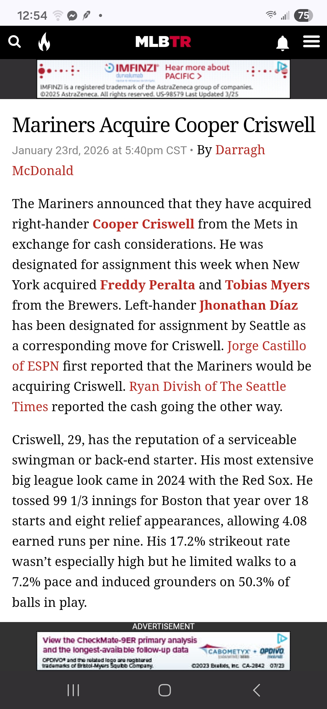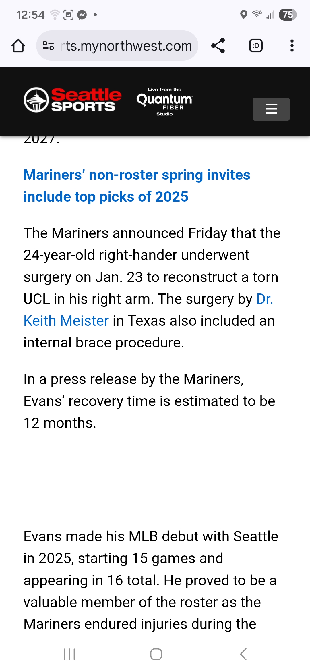 The day Evans went to have surgery, was the same day that the M's acquired Cooper Criswell, no doubt related.seattlefan-daBronx wrote: ↑Fri Jan 30, 2026 9:44 pmWell...if you're going to have it happen...then now is better I guess. 1-5 is set in the rotation.