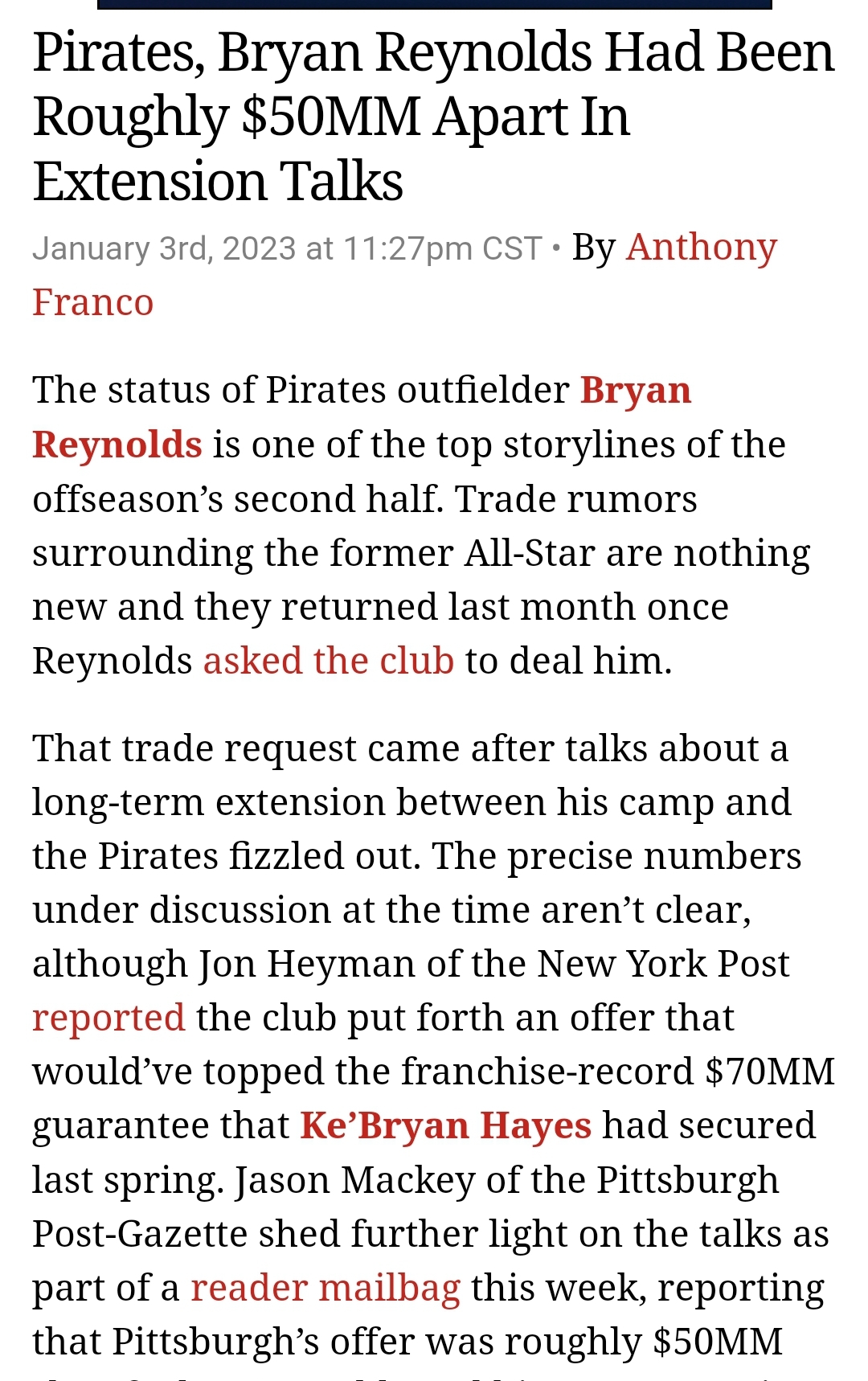 Yep even better but Divish said they are only trading him for Reynolds.Donn Beach wrote: ↑Wed Jan 04, 2023 3:24 amThink you're better off trading JK than making him your 4th outfielder