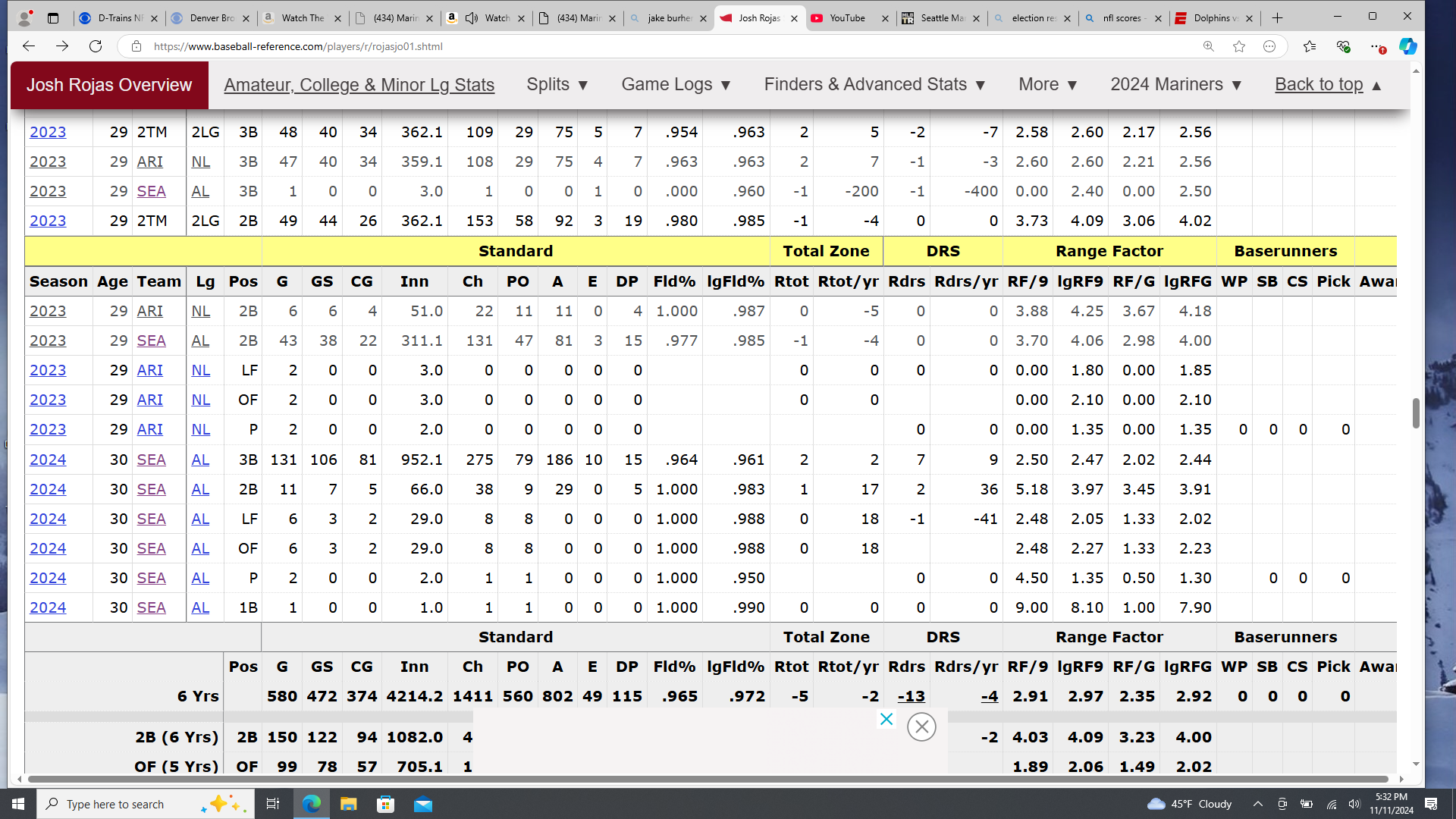 In 2023 as you can see in Az. and Seattle Josh was worth either zero or negative runs on defensive runs saved. But after a preseason to work with Perry Hill he had + ratings at 2B and 3B. Infact; if you bother to look his whole career, he has more negative, and zero values than it does for + defense. Get Burger and I bet Perry works the same magic as he did with Saurez, and Rojas and many others before him. Jack Z tried to focus on D and run prevention. It didn't work: 2010 M's had great D