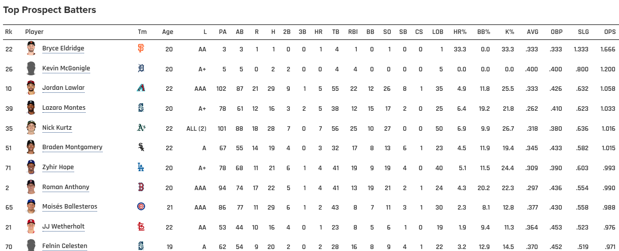 Current stat line: Screenshot 2025-04-24 at 11-22-51 Felnin Celesten Stats Age Position Height Weight Fantasy & News MLB.com.png