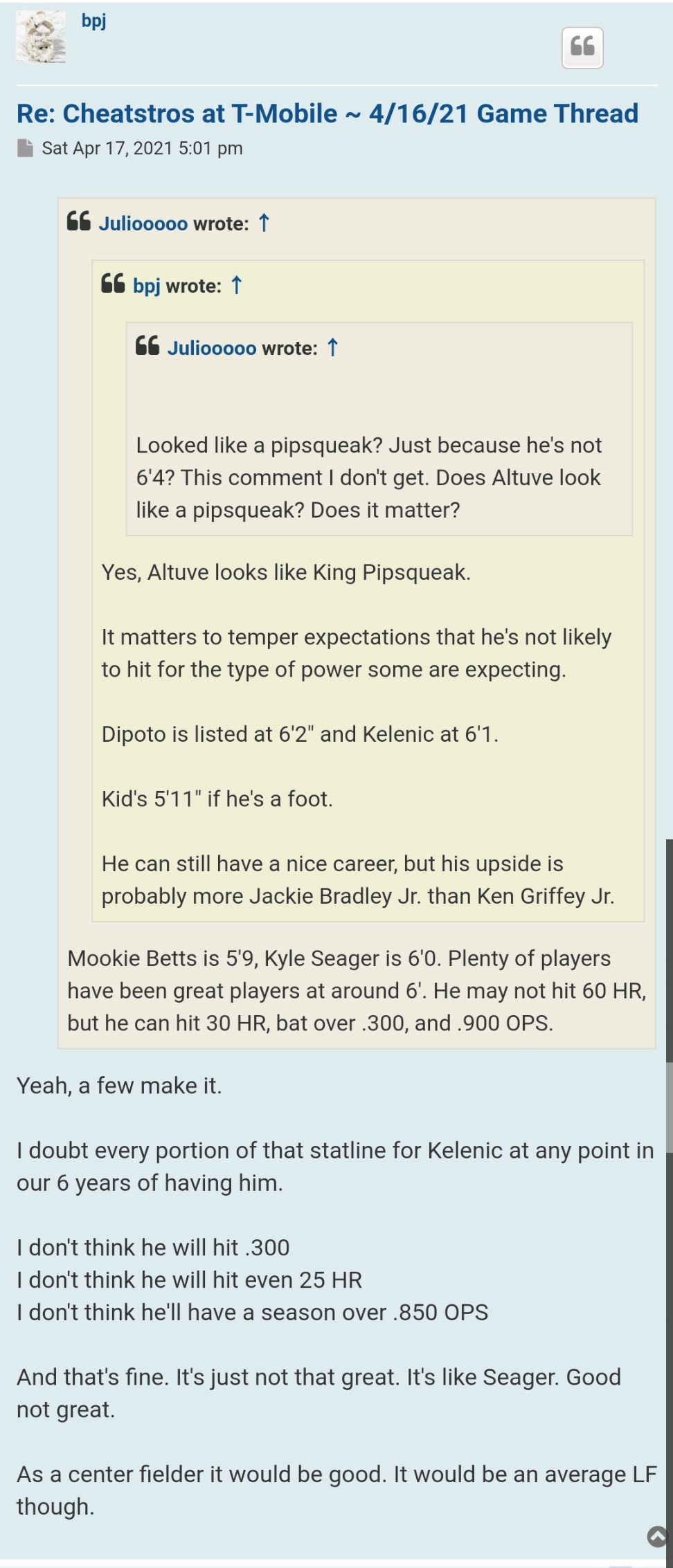 One should never question The Great Kelenic! Actually, you should never question ANY young player before they've had their "time" if you listen to the guys around here.Captain 97 wrote: ↑Fri Jun 04, 2021 3:52 pmWhy was everyone so sure that Kelenic was a can't miss player who was ready for the show? Looking back at his minor league numbers, he has played well but not overwhelmingly great in the minors. .838 OPS in A+ .857 OPS in AA, We have 6 guys in Everett and 3 guys in Arkansas that are putting up similar numbers or better right now. Granted he was at those levels at a younger age but In reality his minor league production is not all that different than guys like Evan White, Jake Fraley and Jose Marmolejos. Its not like he was just dominating and playing head and shoulders above everyone else. Did everyone just get caught up in unfounded hype?