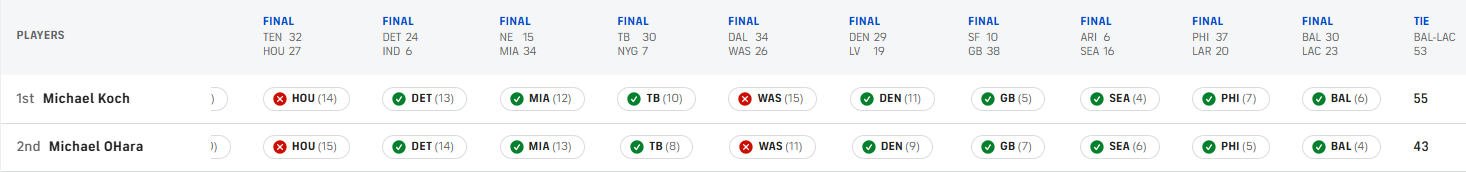 I must have lost the tiebreaker to Michael Koch this week, but I can't tell for sure. We both finished with 92 points lol. My tiebreaker was 43 points, but I can't see the other tiebreaker point picks on my screen. This pool is wicked close!
