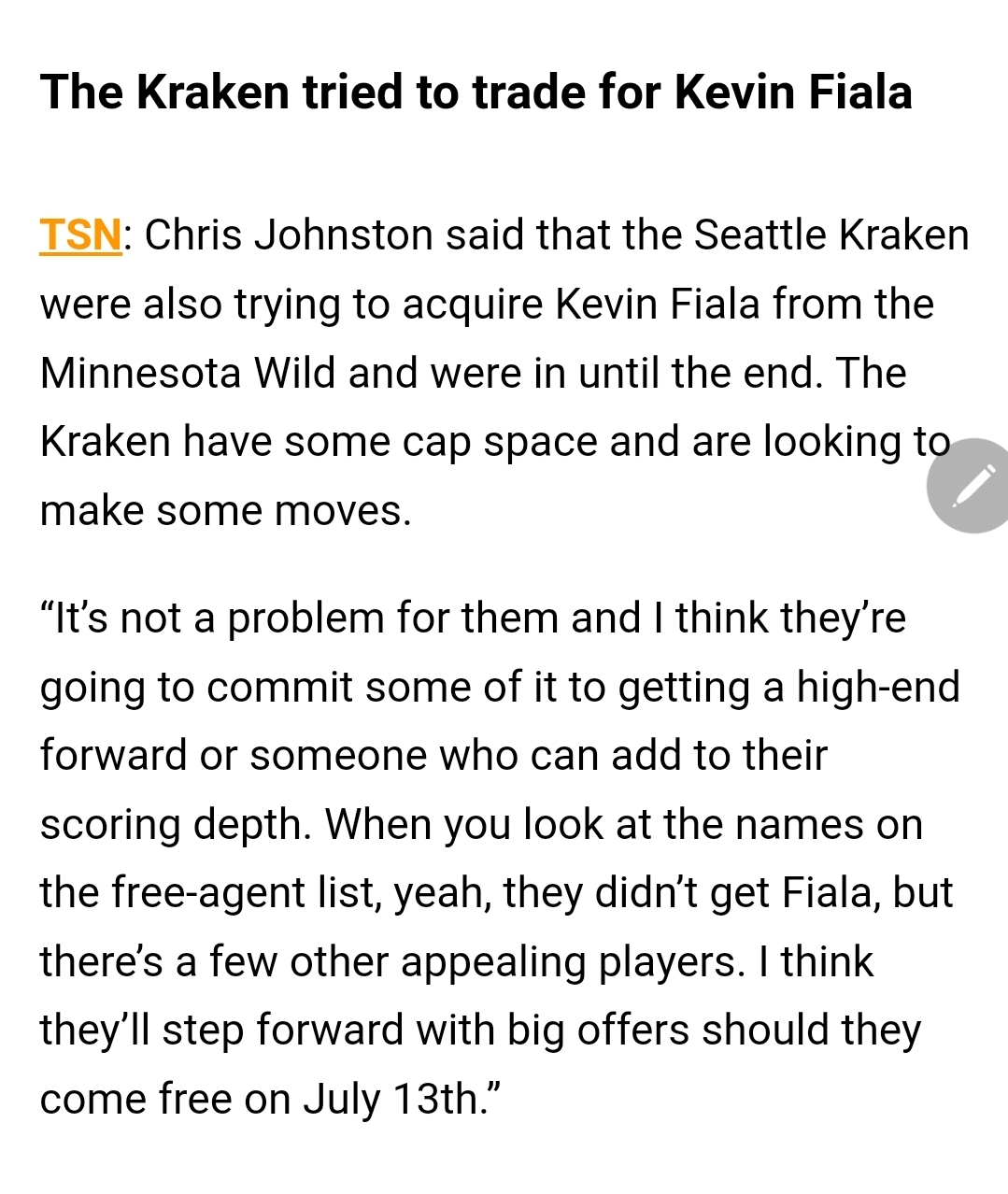 After the trade was made, Fiala immediately signed a seven-year deal with the Kings that comes with a $7.875 million AAV. That would have made him the second-highest paid player on Minnesota, and wasn't the sort of commitment the team could make right now without, as GM Bill Guerin described, having to trade out two or three others from the roster.