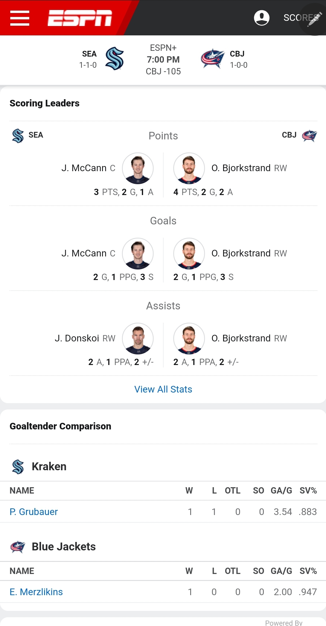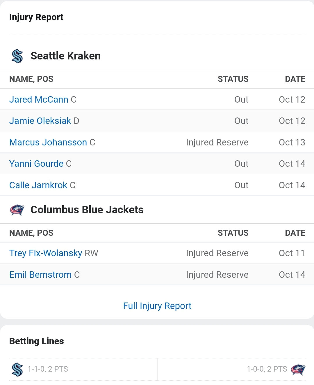 We were already thin at center(Matty Beniers can't get here soon enough). It’s an interconference matchup on the ice in the Buckeye State as the newest team to hit the ice takes on a recent expansion club of their own. The Seattle Kraken are on the road as they make the trip to face the Columbus Blue Jackets Saturday night. Seattle comes in off the first victory in franchise history as they edged Nashville 4-3 on the road Thursday night. Columbus rolled to a one-sided 8-2 victory over Arizona at home Thursday night in their series opener. Seeing that the Kraken are playing their third contest in franchise history, this marks the first time that the two teams have taken the ice against each other.