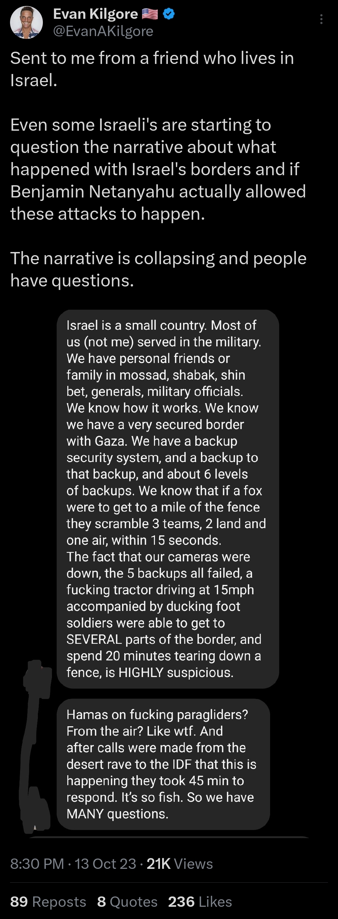 What's your take on things? Did Hamas make an incursion into Israel? Did they kill civilians? Or do you think it's all fake?