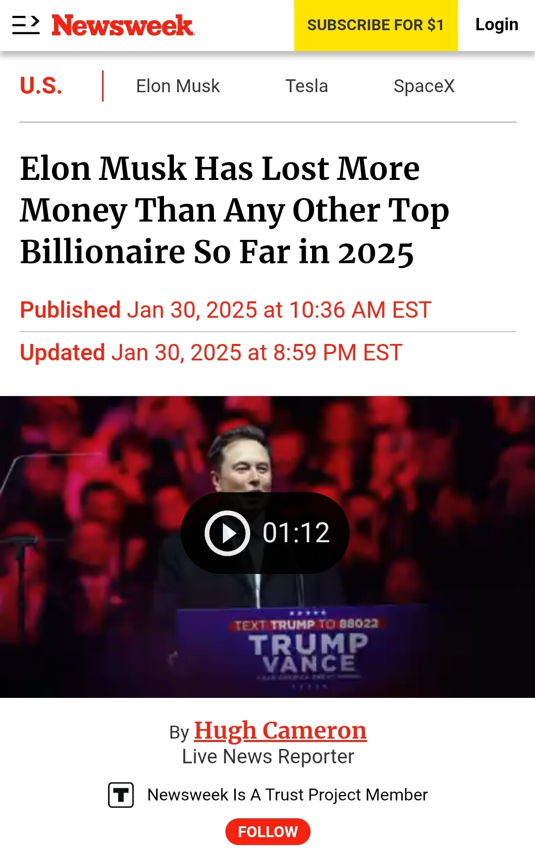 I tried verifying what you say here and found exactly the opposite. What makes you believe he's richer than when he started?Seattle or Bust wrote: ↑Tue Feb 11, 2025 1:27 amYeah totally... Musk is only $150 billion richer than when he started.Mel Bradford wrote: ↑Tue Feb 11, 2025 1:15 amI'm reminded of the fact that neither Trump nor Musk are gaining money from the DOGE endeavor. In fact Musk is not receiving a paycheck and Trump is working for $0. The true definition of public servants.