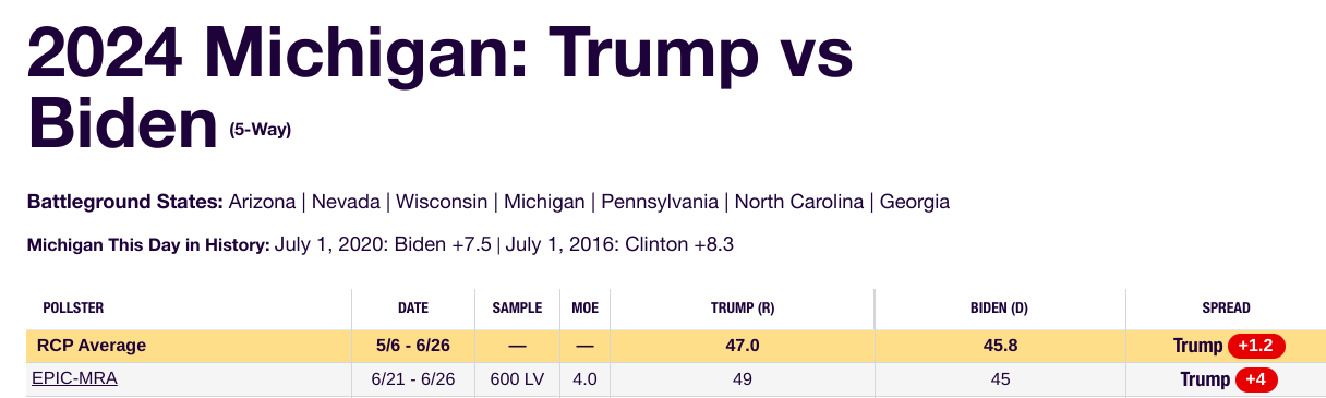 This is a poll that was completed BEFORE the debate. Trump is +4 in Michigan. Not that in 2016 and 2020 Hillary and Biden were both +8.