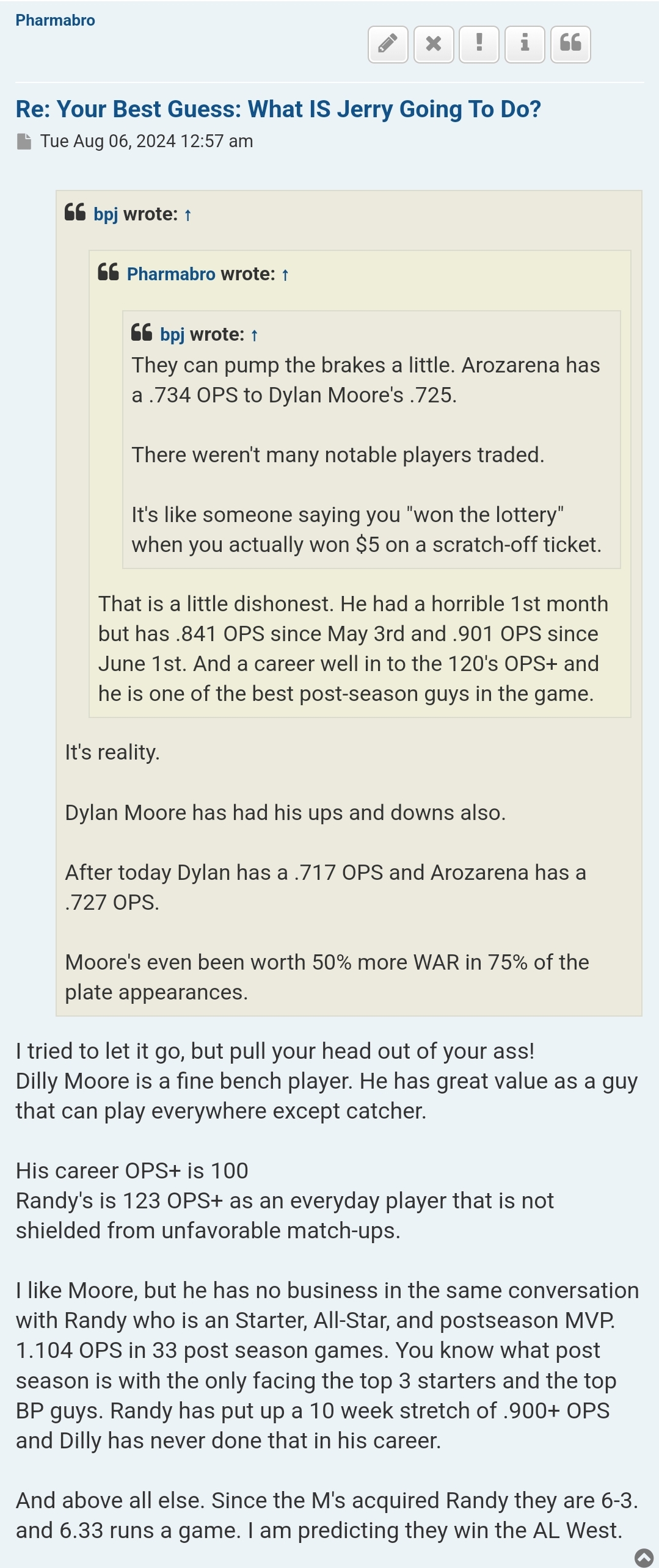 When they made the decision they didn't know they were going to fall flat on their face so that is total hindsight and maybe they wouldn't have, we shall never know. What we do know is they prospect hugged (Prospects that all have some sort of flaw) and they did fall flat on their face and now need to suffer the consequences.Donn Beach wrote: ↑Sun Aug 18, 2024 4:17 pmPlease, the mariners have been characterized as among MLB most aggresive teams at the deadline and they have fallen flat on their faces, adding Rooker changes all that? Terms of the future we are firing everybody, let the new addministration build their roster