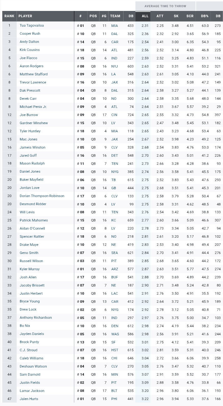 There's a huge table at PFF with information on how long QBs take to throw the ball and with a breakdown (stats + grades) between passes thrown in under 2.5 sec and passes thrown in 2.5 or more. I left out some columns that weren't that important.