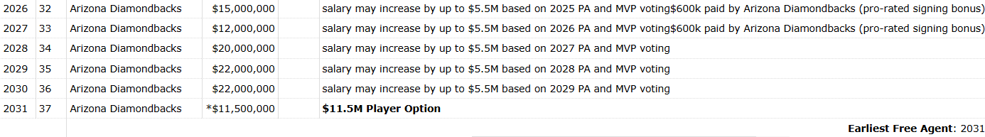 $9M a year??????Big_Maple wrote: ↑Mon Nov 10, 2025 7:19 pmThe obvious question is “why”? He’s a marquee, cornerstone member of the franchise. I always thought he’d retire a diamondback.