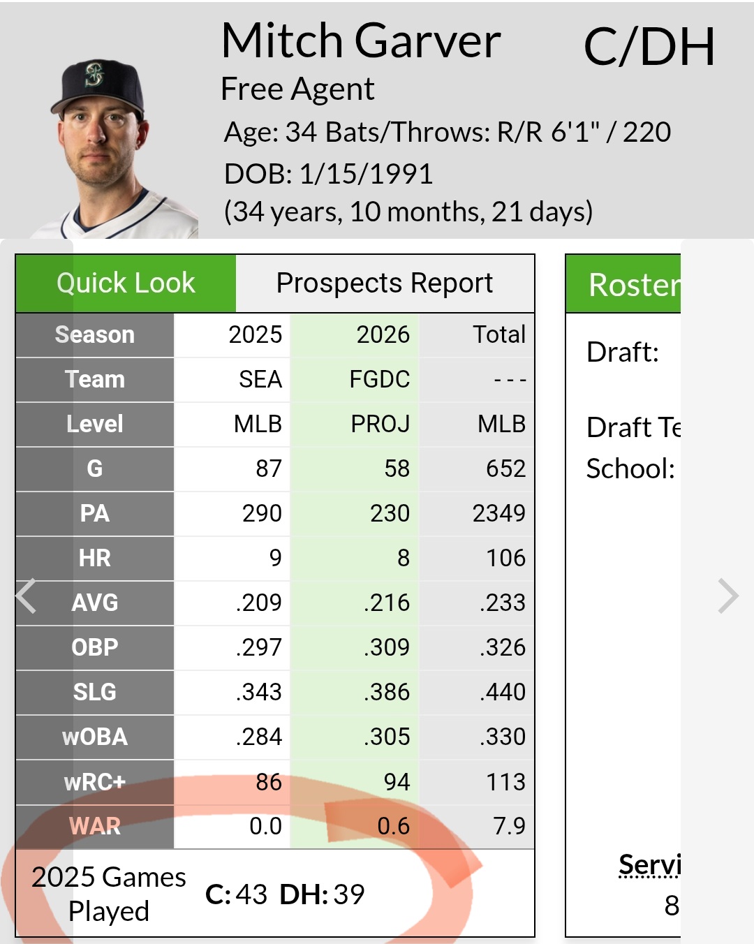 If he could hit orrrrr have defensive value greater than -6 DRS then maybe resign him but there are other back up catchers out there.Sexymarinersfan wrote: ↑Sun Dec 07, 2025 3:42 amExcellent point. They paid a lot of money for this guy to produce and replicate his numbers from when he was with the Rangers, hoping he would break out of a slump. No more DH days for Mitch, IF he even comes back, unless he's absolutely torrid. Great post.bpj wrote: ↑Sun Dec 07, 2025 3:36 amI think the only real issue with Garver was more of a Wilson/Dipoto/Hollander problem.